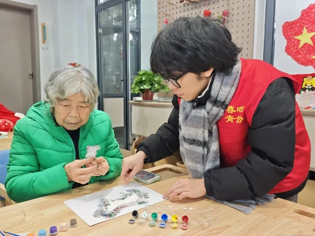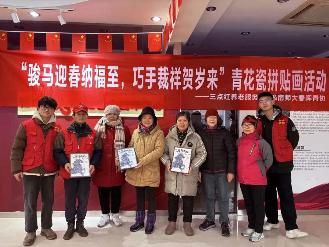 2026年1月20日下午,南京市三点红养老服务中心内暖意融融,实践团队在此开展青花瓷拼贴画活动,社区长者们齐聚一堂,在瓷片流转间触摸非遗温度,在巧手拼合中迎接马年新春。