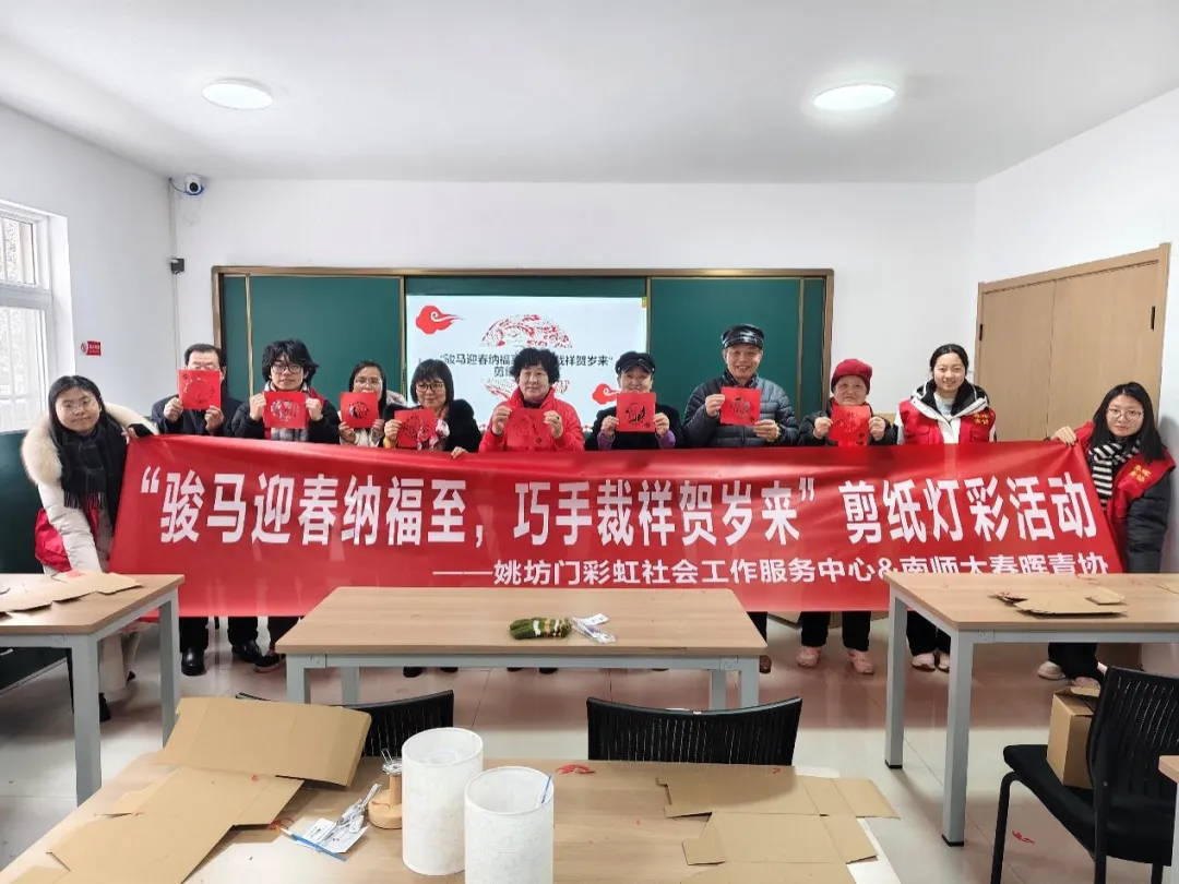2026年1月20日上午,实践团队走进尧化门街道青田雅居社区,开展剪纸灯彩制作体验活动。本次活动旨在通过陪伴社区长者亲手制作传统灯彩的方式,传递温暖情谊,丰富长者生活,并进一步弘扬剪纸这项富有魅力的非物质文化遗产。