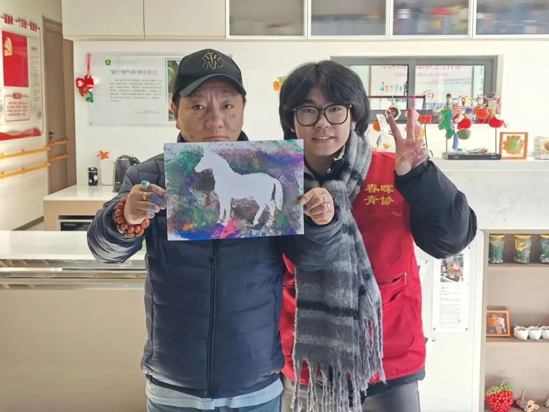 随后进入制作环节,志愿者们为长者们发放材料,现场示范颜料调配、拓印手法与图案修饰技巧,分组陪伴在长者身边提供指导,让每位参与者都能从容体验创作乐趣。原本普通的纸张与颜料,在长者们的巧手下呈现出一幅幅灵动的骏马拓印画,或昂首奔腾,或缀以祥云福纹,满是新春喜庆。活动最后,长者们纷纷举起作品相互欣赏、分享心得,脸上洋溢着满满的成就感与喜悦,让非遗技艺成为联结情感的纽带。
