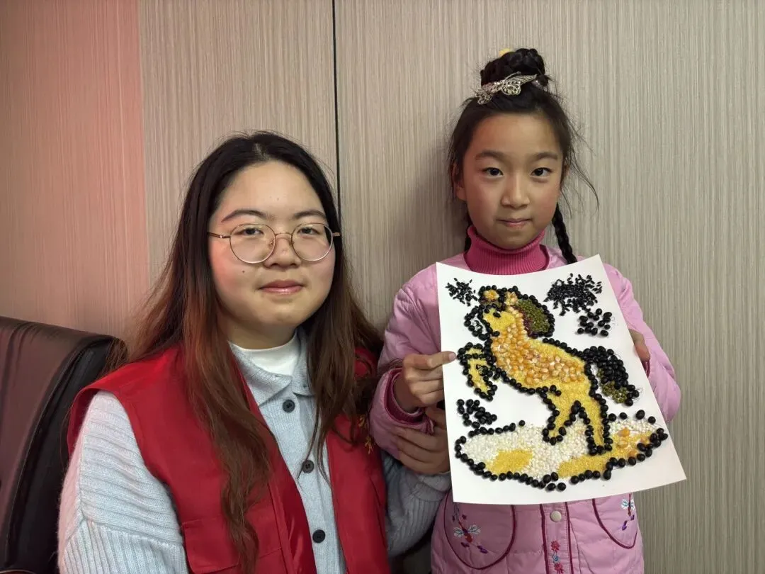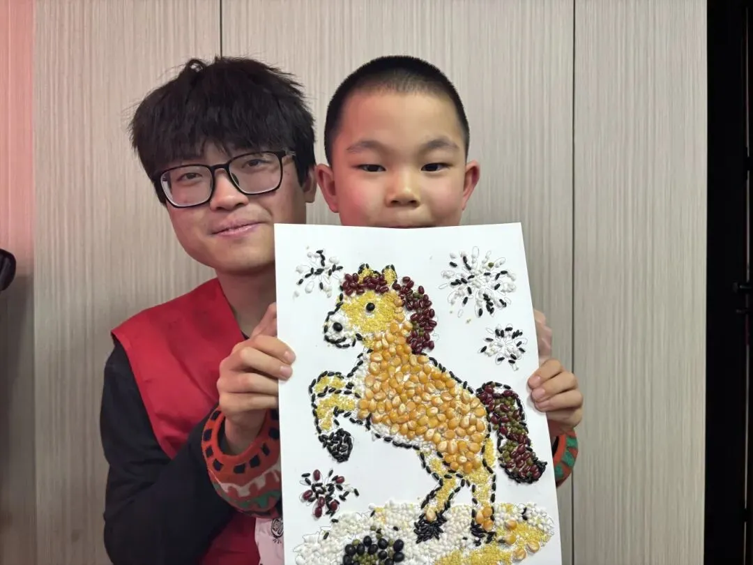 制作过程中,志愿者们分组陪伴在孩子们身边,提供一对一指导:有的协助孩子固定画纸,有的指导胶水用量避免谷物滑落,有的帮忙调整谷物布局让骏马造型更加灵动,还有的引导孩子合理搭配五谷颜色。原本普通的五谷杂粮,在孩子们的巧手下逐渐勾勒出一幅幅鲜活的骏马图景,有的昂首奔腾,有的缀以祥云纹样,每一粒谷物都承载着对新春的美好期许。