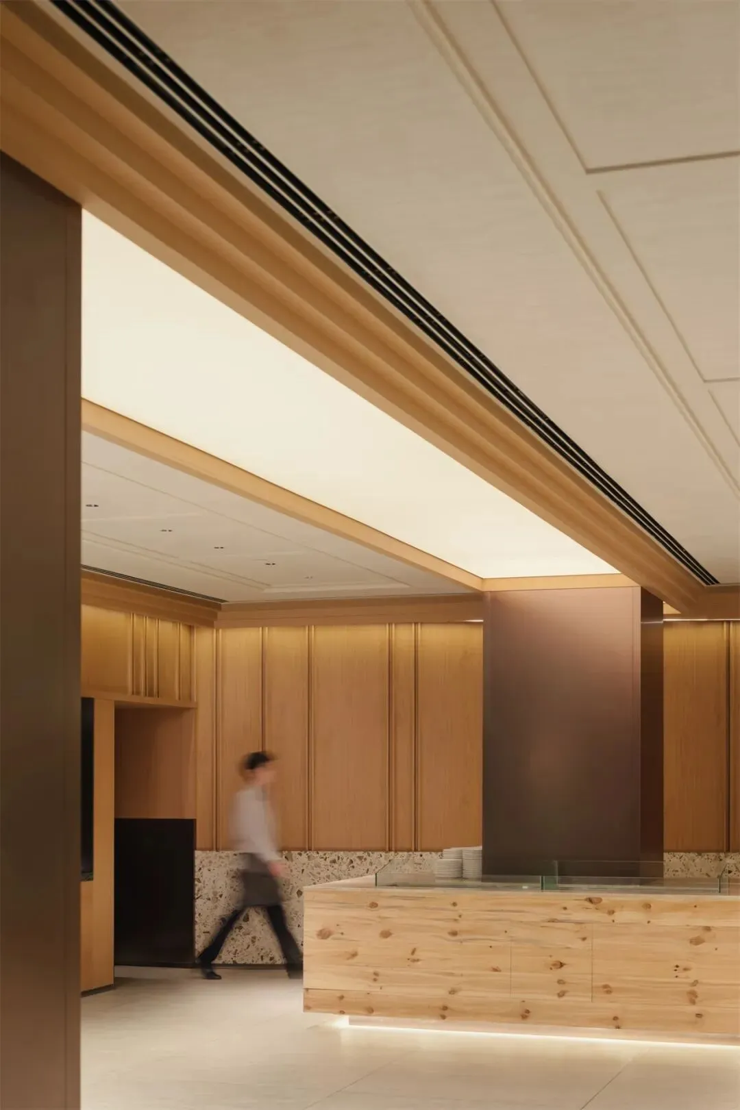 中岛区作为场景焦点,以高灵活度回应全天候的运营需求。早餐时为取餐台,其余时段则转化为水吧或夜间酒吧台。