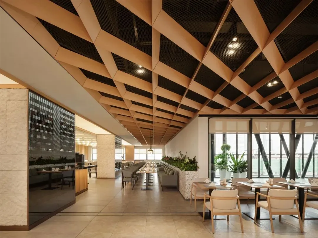 向外延伸,自然用餐区成为连接室内与屋顶花园的过渡空间。天花以自然木纹铝格栅构建秩序与节奏,营造轻盈而舒展的空间表情;可完全开启的落地玻璃实现视觉与动线的渗透,使光、风与绿意成为空间体验的一部分。