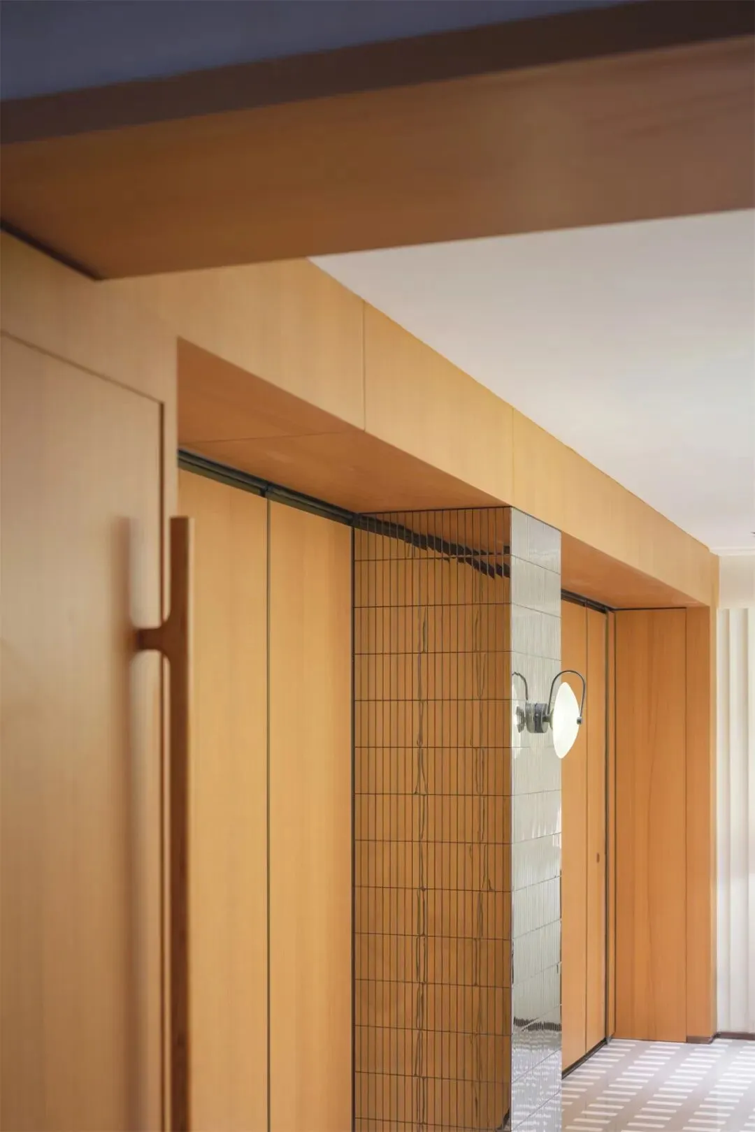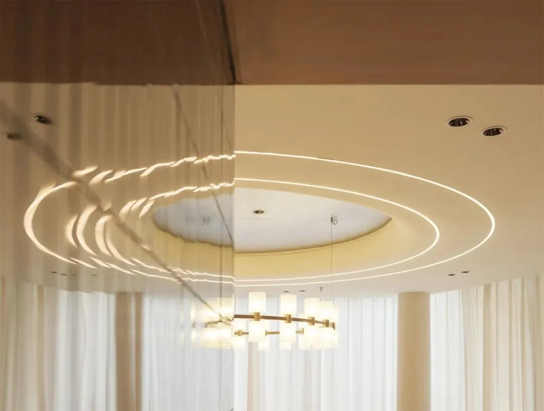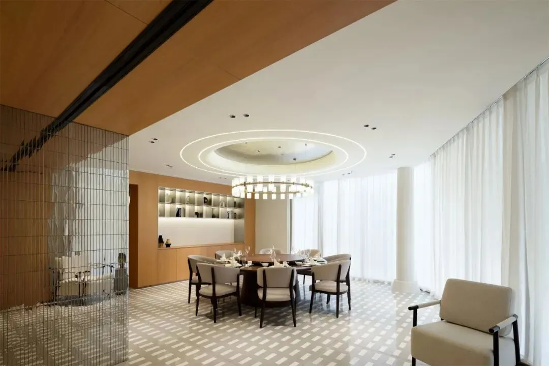 As the order of the public realm unfolds, the spatial narrative shifts from openness to focus, transitioning the experience from everyday interaction to a more ceremonial and private setting. Within the Private Dining spaces, the delicate luster of metallic tiles complements the three-dimensional texture of recessed wave aluminum panels. This interplay enhances the wall's sense of layering and order, revealing rich expressions under shifting light and shadow.