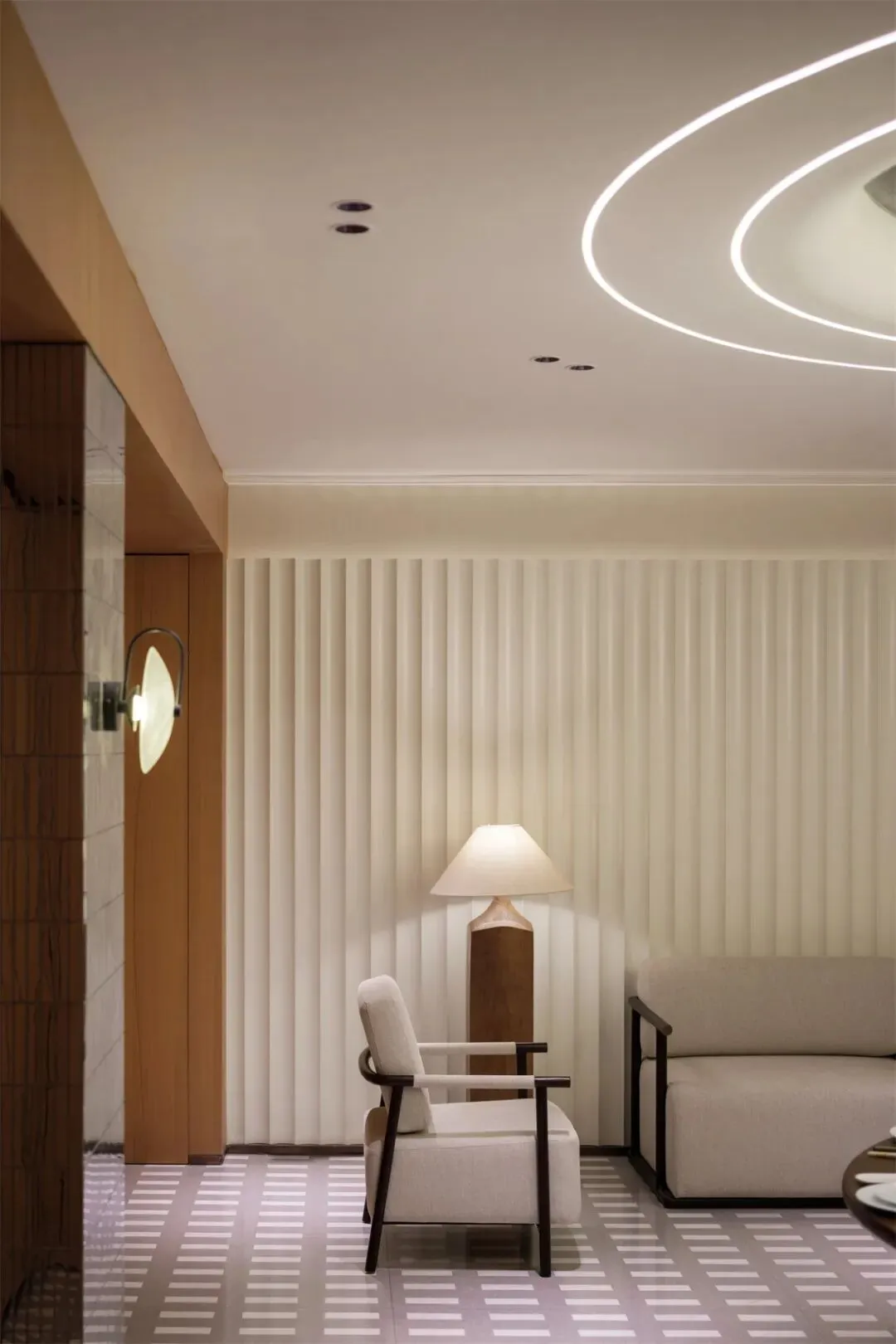 The Feature Wall employs halftone silkscreen combined with UV printing to translate Nanjing’s urban scenery into dot-matrix images embedded within the wallpaper. From a distance, it reveals the city skyline and historic architectural outlines; up close, it discloses a delicate granular texture, creating layers and rhythm as the viewing distance changes. Regional cultural imagery is integrated into the space through contemporary expression, complementing the warm lighting and surrounding materials to make the wall a vital interface connecting urban memory with the interior ambiance.