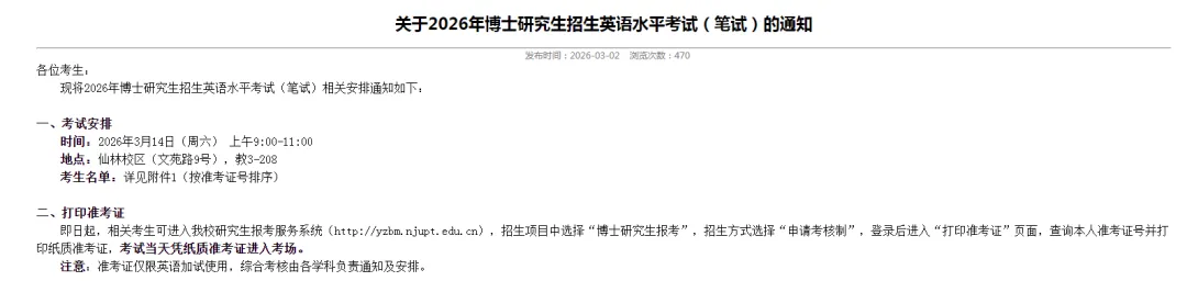 即日起,相关考生可进入我校研究生报考服务系统(http://yzbm.njupt.edu.cn),招生项目中选择“博士研究生报考”,招生方式选择“申请考核制”,登录后进入“打印准考证”页面,查询本人准考证号并打印纸质准考证,考试当天凭纸质准考证进入考场。