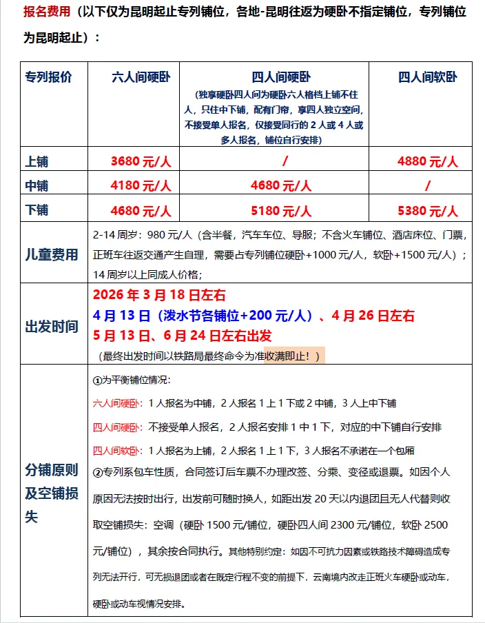 1.交通:南京—昆明往返火车硬卧(不指定铺位);昆明起止空调旅游专列软/硬卧,当地空调旅游大巴,一人一正座;