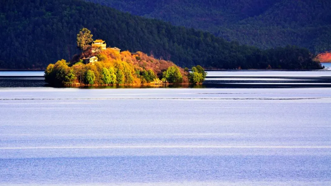 前往泸沽湖大落水游船码头乘猪槽船登【里务比岛】, 游览【里务比寺】里务比岛位于泸沽湖的中南部, 岛屿的一侧为石笋, 成为天然的码头, 一条蜿蜒的小道直接通往岛屿的顶部, 道路旁边有许多杜鹃花以及野樱桃树 。花丛的尽头为藏传佛教寺院里务比寺, 岛顶有一白塔。里务比岛与谢瓦俄岛, 里格岛并称为泸沽湖蓬莱三岛。