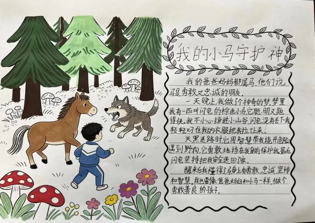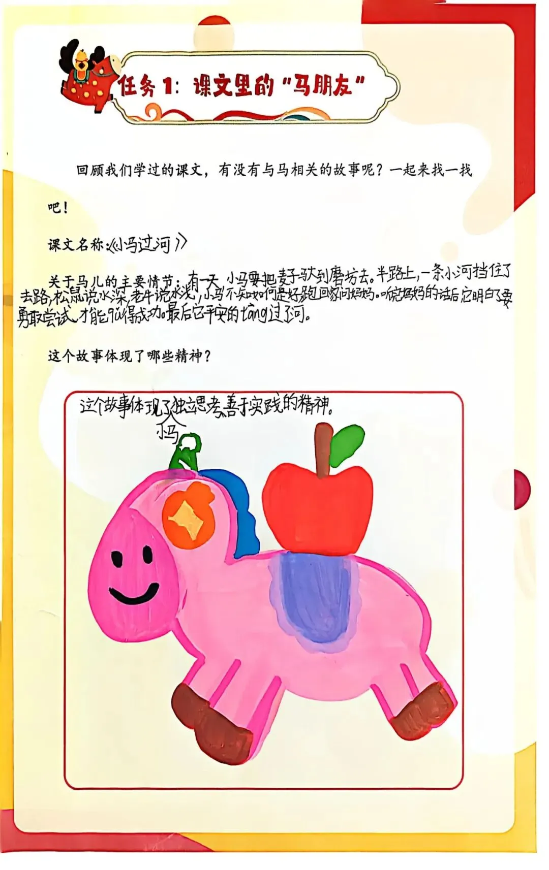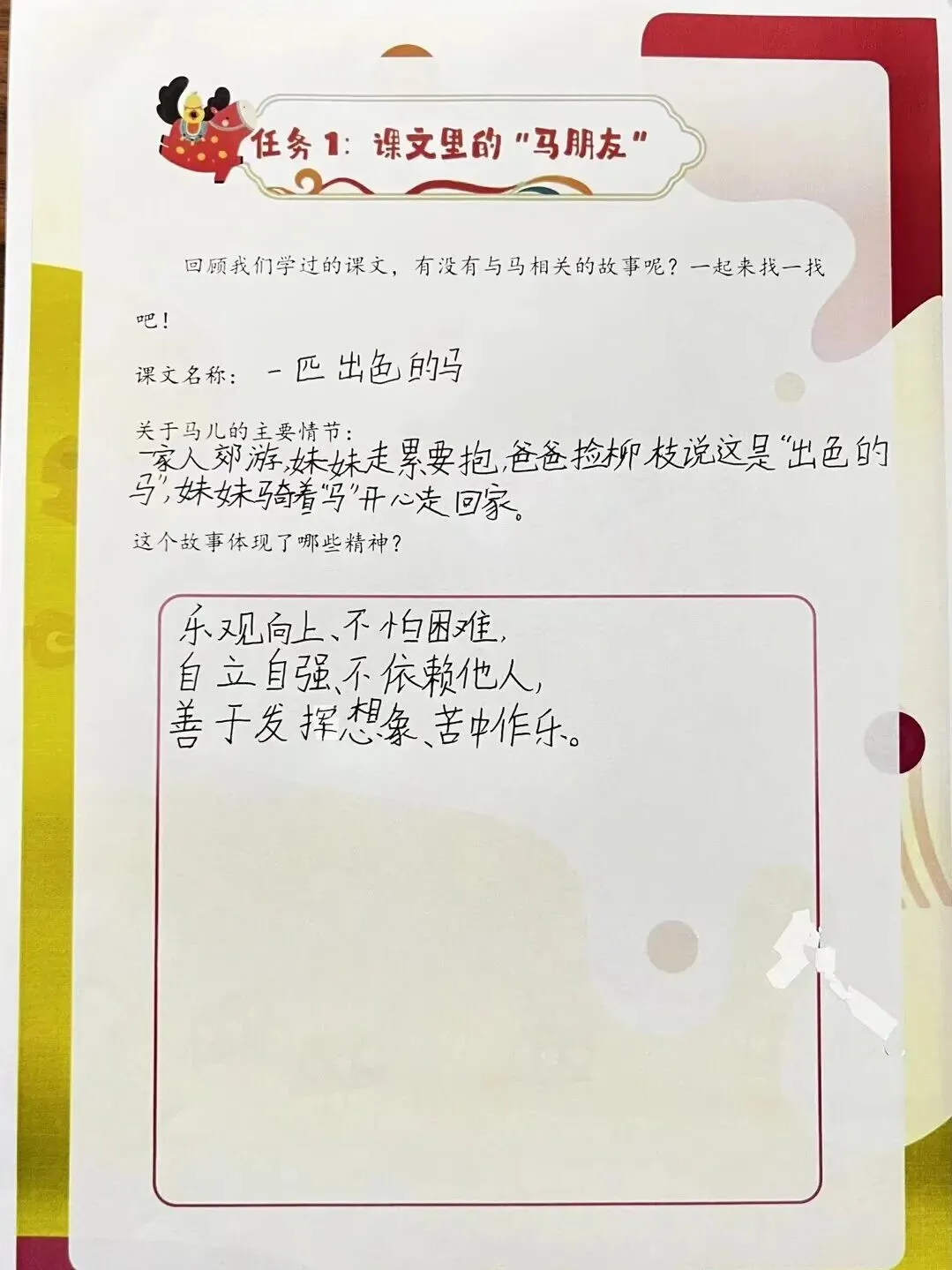 寒假伊始,孩子们先从最熟悉的课本出发,寻找那些藏在字里行间的“马朋友”。有人发现了勇于尝试的小马,有人读到了勇往直前的骐骥。