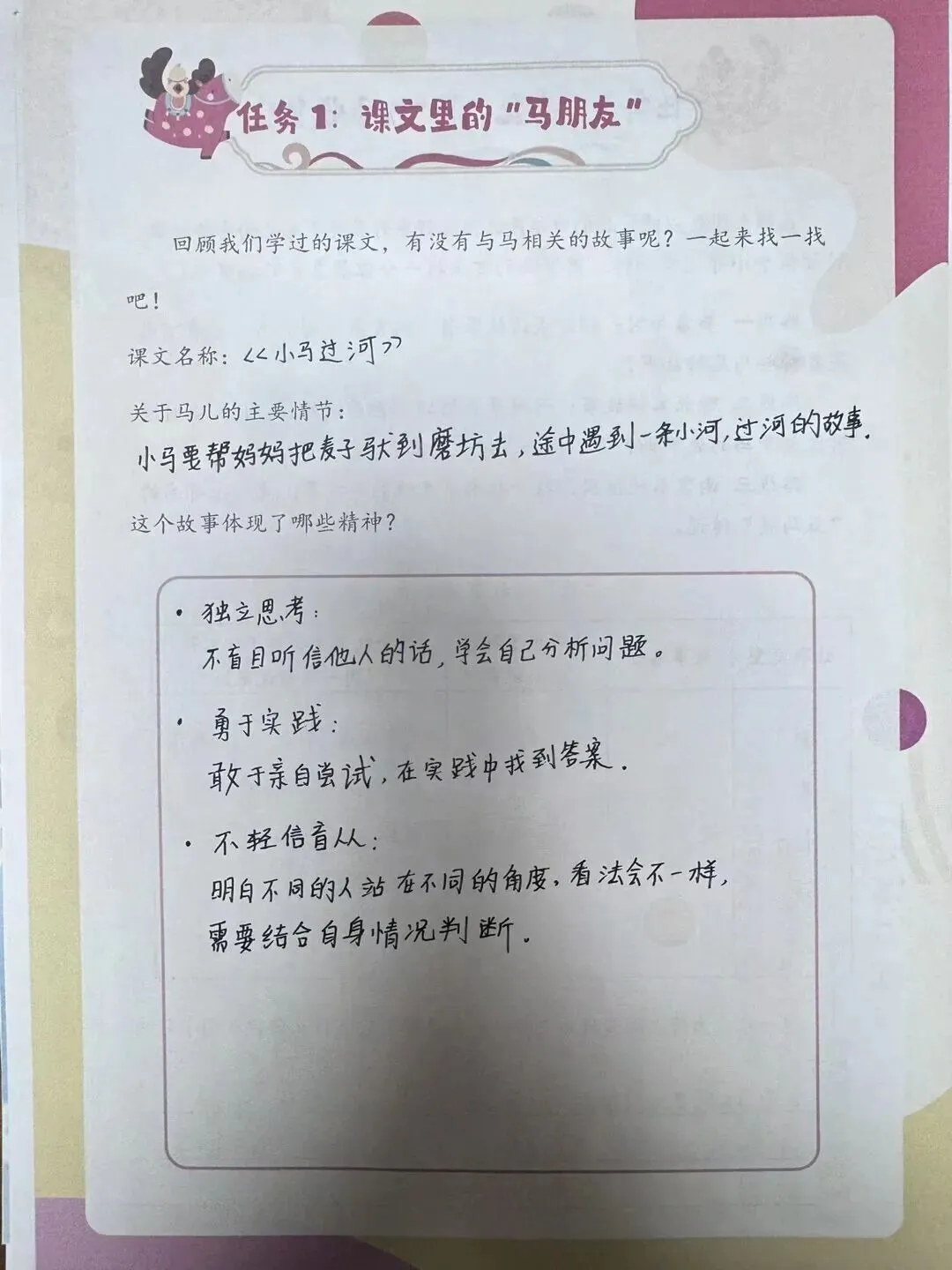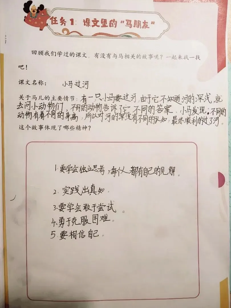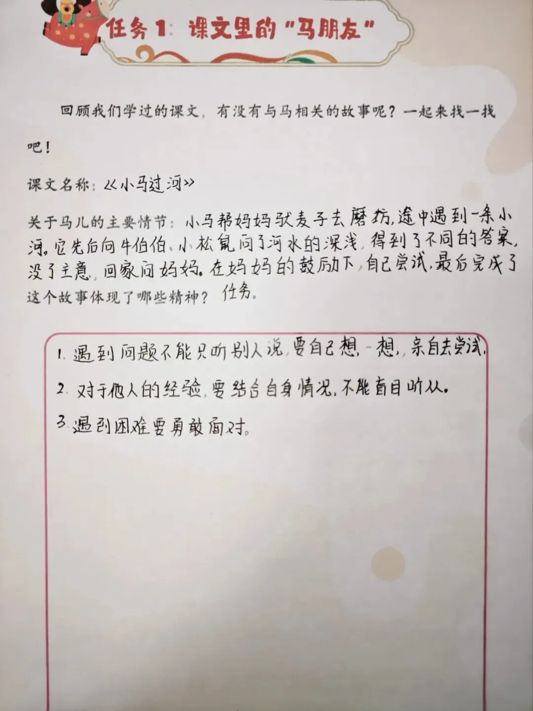 寒假伊始,孩子们先从最熟悉的课本出发,寻找那些藏在字里行间的“马朋友”。有人发现了勇于尝试的小马,有人读到了勇往直前的骐骥。
