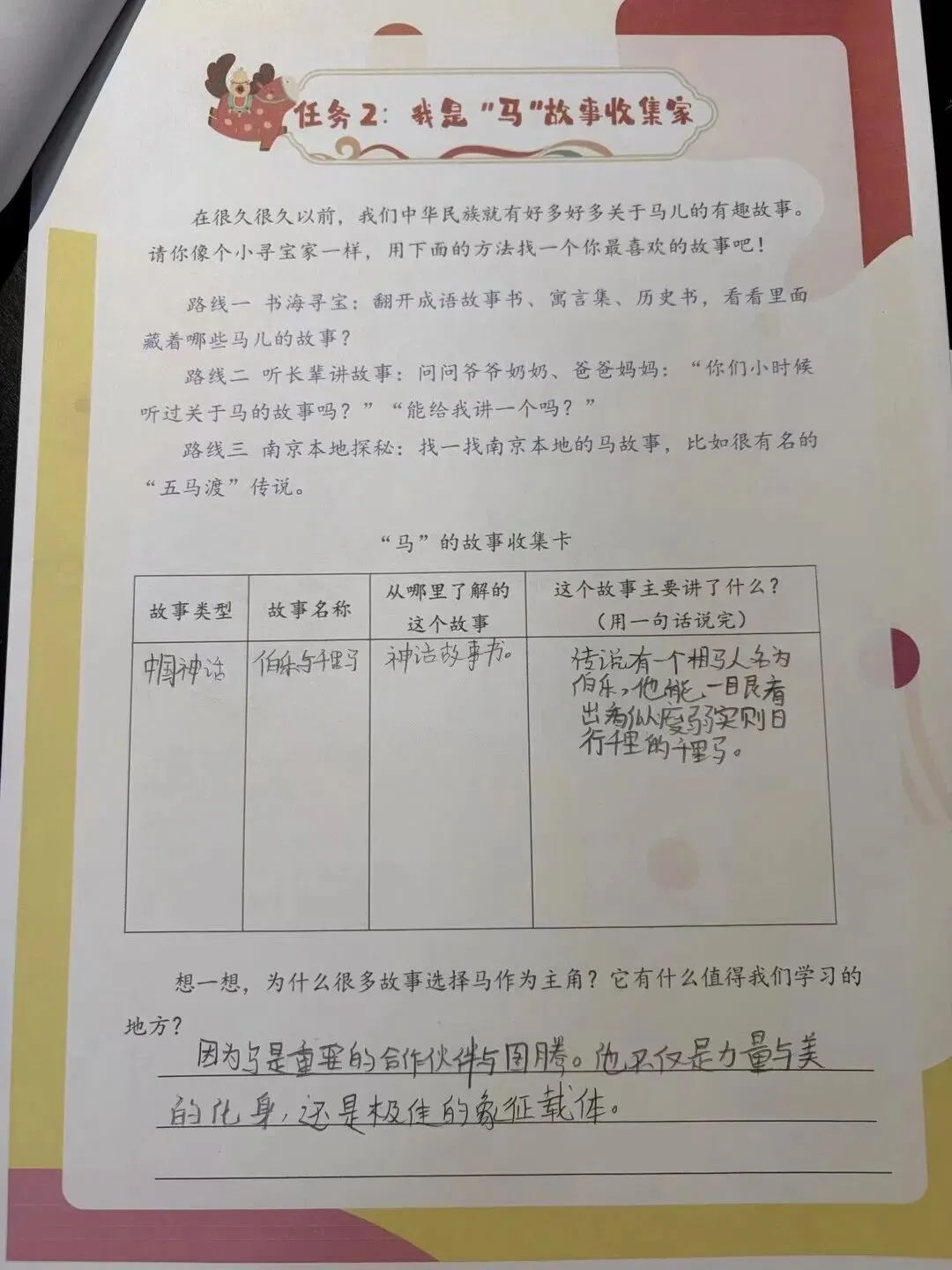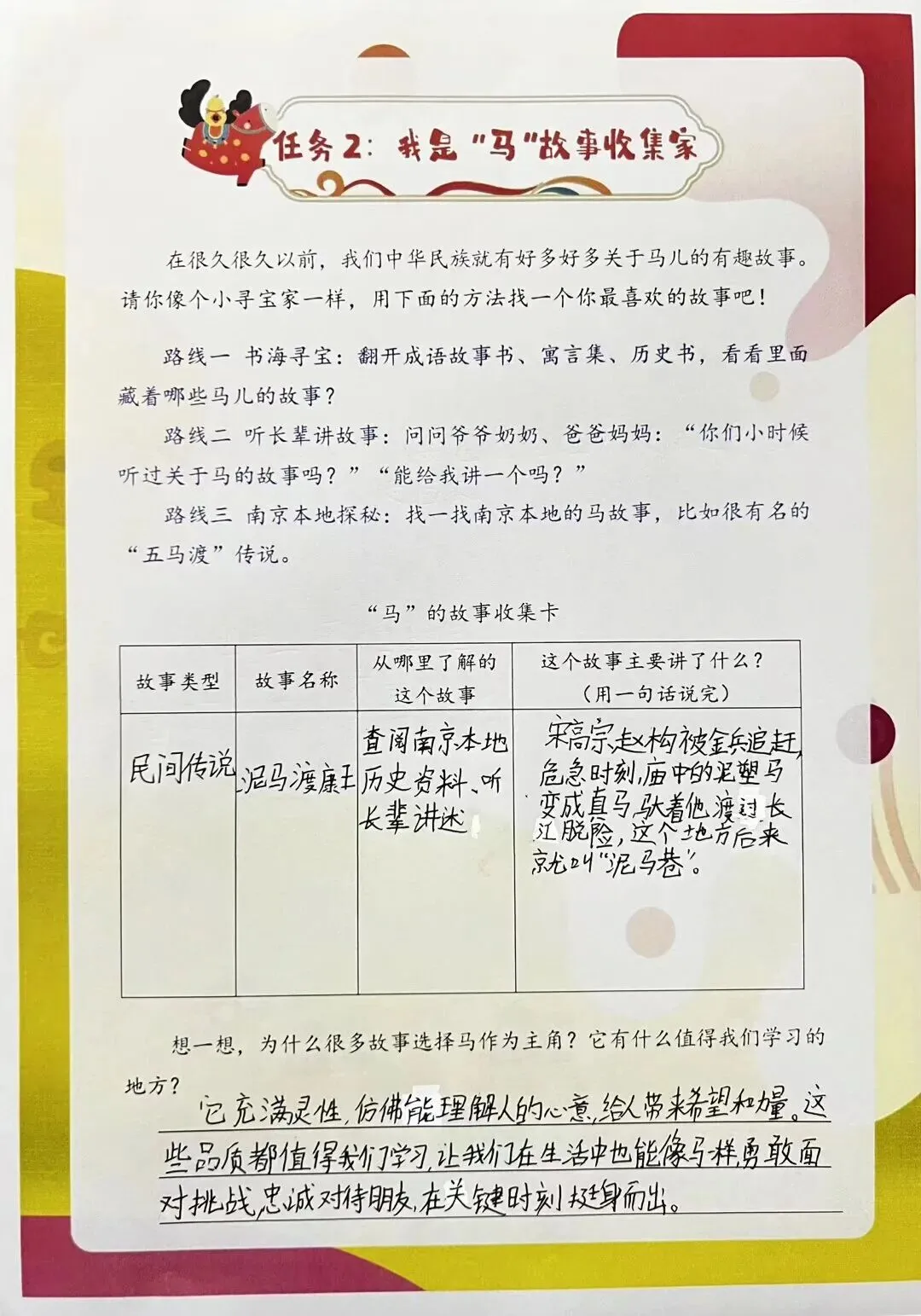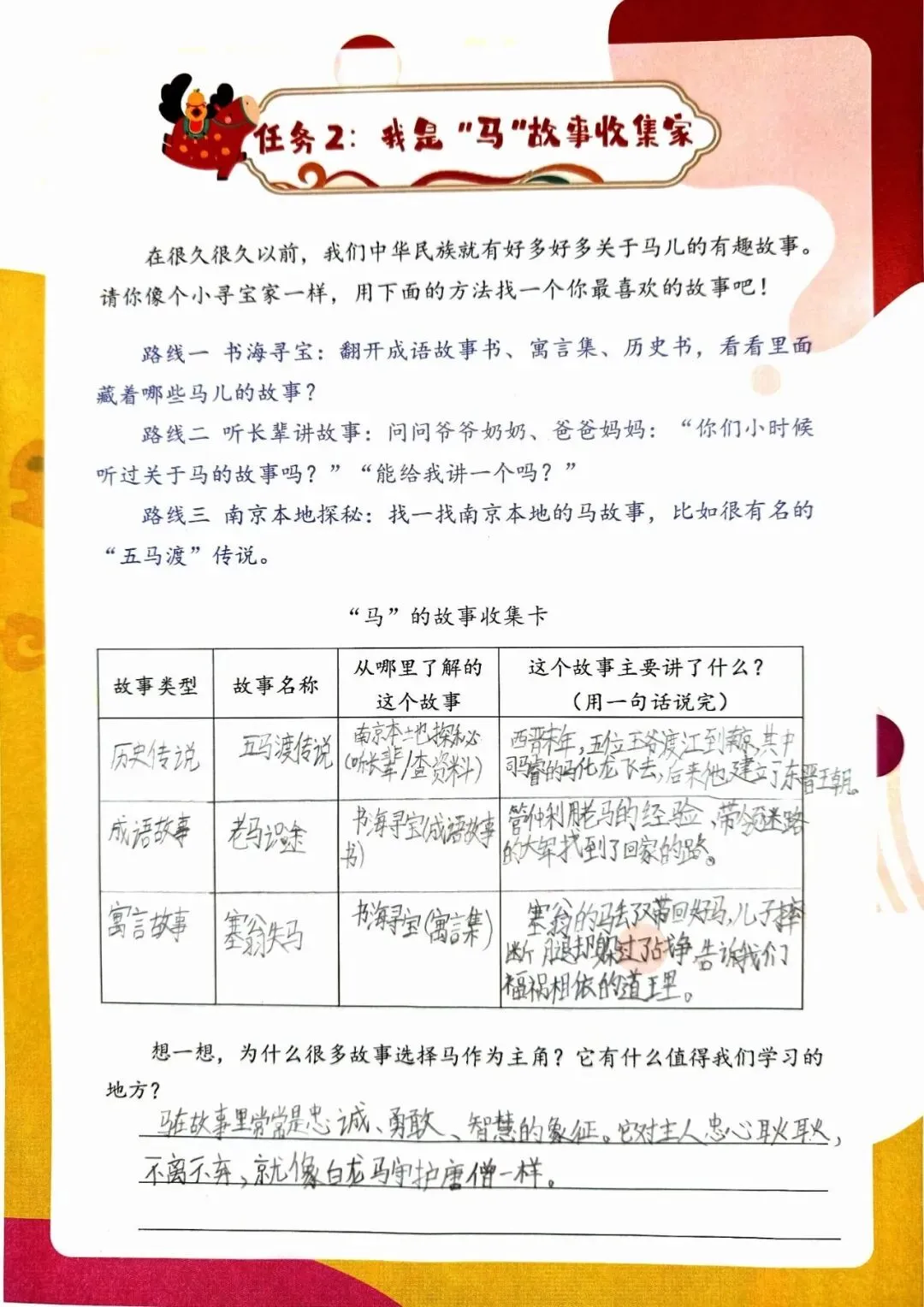 走出课本,孩子们又化身为小小“拾遗者”,在更广阔的天地中搜寻马的传说。有人翻成语书、翻寓言集,专挑带“马”字的看;有人拉着爷爷奶奶,问他们小时候听过哪些关于马的老故事;还有人打听南京本地的传说,还真挖出了“五马渡”这样的老典故。每找到一个故事,他们就认真填好“故事收集卡”,还不忘想一想:为什么这么多故事都爱用马当主角?是啊,马儿身上藏着那么多值得学习的闪光点。