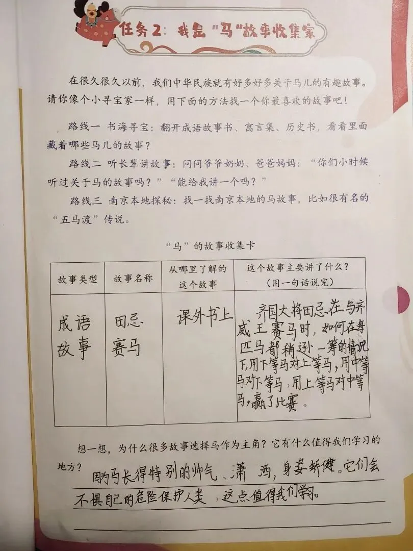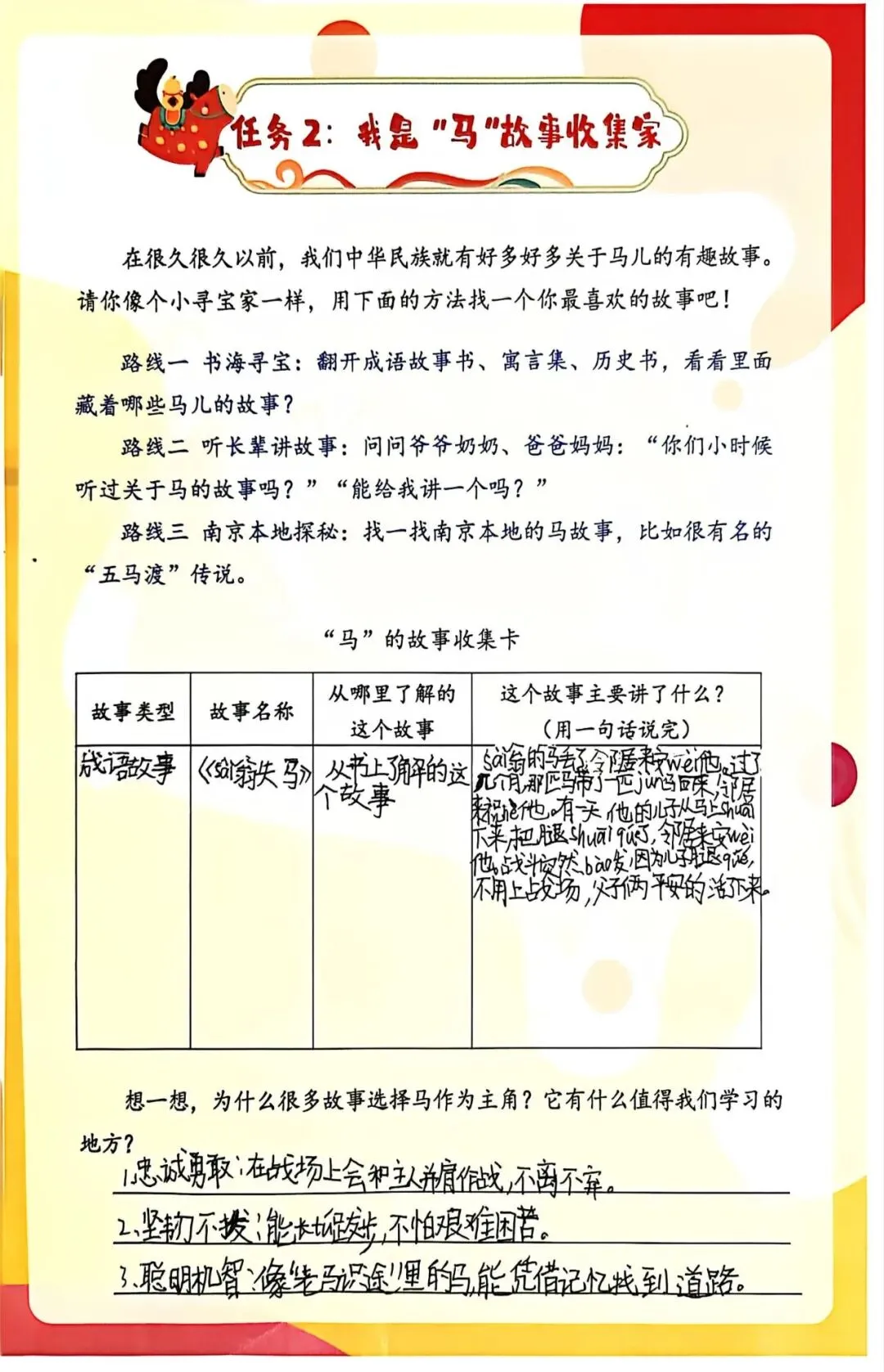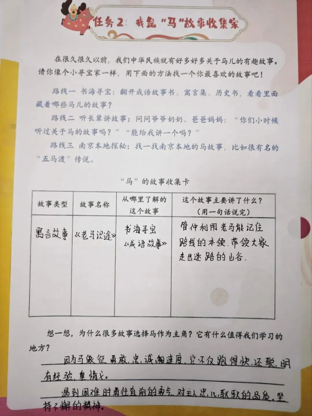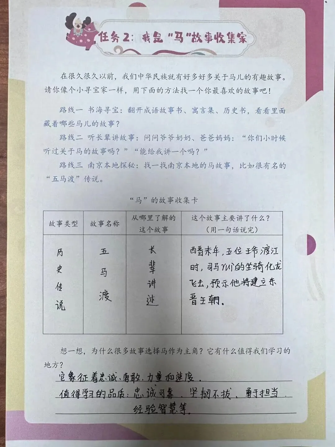走出课本,孩子们又化身为小小“拾遗者”,在更广阔的天地中搜寻马的传说。有人翻成语书、翻寓言集,专挑带“马”字的看;有人拉着爷爷奶奶,问他们小时候听过哪些关于马的老故事;还有人打听南京本地的传说,还真挖出了“五马渡”这样的老典故。每找到一个故事,他们就认真填好“故事收集卡”,还不忘想一想:为什么这么多故事都爱用马当主角?是啊,马儿身上藏着那么多值得学习的闪光点。