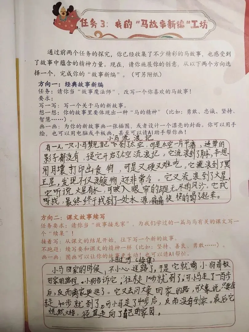 他们认真记录故事情节,揣摩角色精神。翻着翻着,孩子们发现,课文里藏着许多马的故事——有忠诚的,有勇敢的,还有一路奔跑不停歇的。他们记下情节,也记住了马儿身上的那股劲儿。