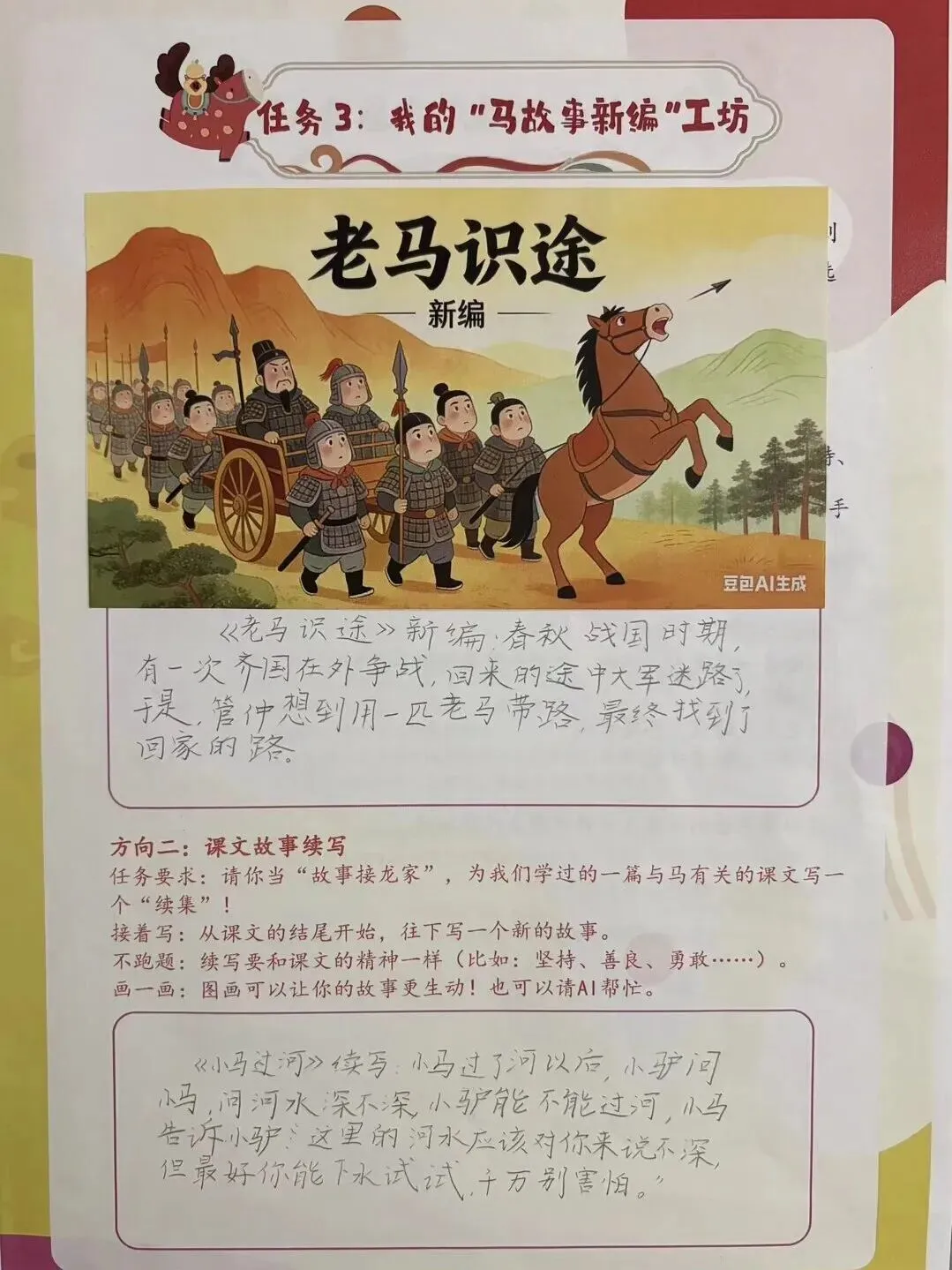 收集了满满一箩筐的故事,孩子们开始动手“焕新”。改写老传说的,让老故事有了新情节;续写课文的,接着往下编“后来怎么样了”。写完不算完,还得配插图——水彩笔涂的、平板画的、AI帮忙设计的,一个个都端了出来。那些流传了多年的老故事,到了孩子手里,又变了个样。