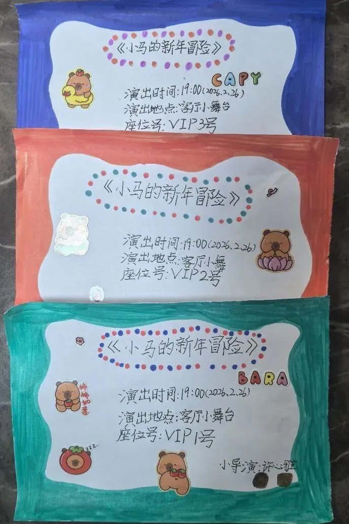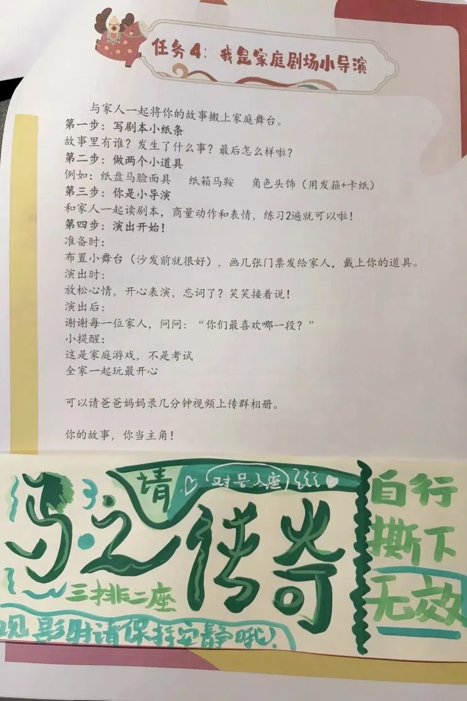 最后一站,故事从纸上“跳”了出来。孩子们成了“小导演”“小演员”,和家人一起把自编的马故事搬上家庭舞台。他们写剧本、做道具——纸盘做的马脸、纸箱做的马鞍、自制的头饰,样样有模有样。沙发前的小剧场开演啦!哪怕忘词了,笑一笑继续演,家里满是欢声笑语。家长们录下的视频,传进班级群相册,也把这份温馨定格成新年的美好记忆。