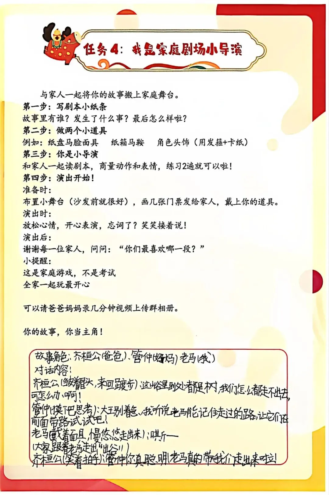 翻过的书、听过的老故事、画过的插图、家里的小剧场——孩子们做了一件完整的事:把“马”从书里牵出来,又把它请进自家的客厅。谢谢家长们陪着翻书、陪着演、陪着笑。文化这回事,就这么从纸面上走进了日子里头。