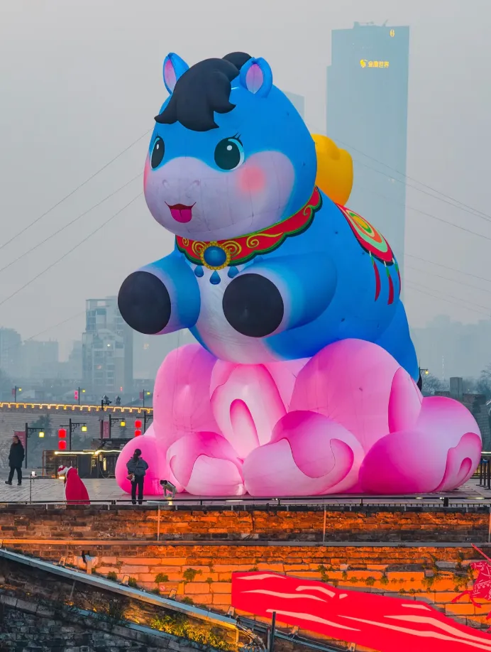 16米高的“聚宝小蓝马”通体奶蓝色,脸颊两团粉嘟嘟的腮红,软萌感拉满。