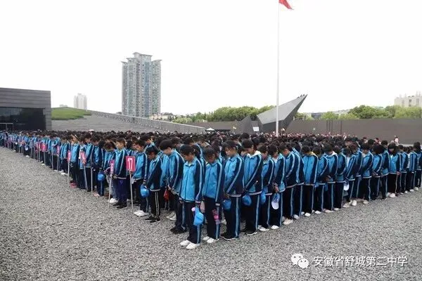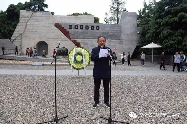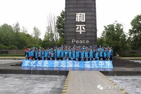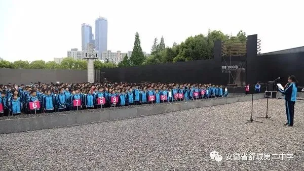 悼念同胞,勿忘国耻,奋发新作为。在庄严和肃穆中,同学们步入侵华日军南京大屠杀遇难同胞纪念馆。在悼念广场,参加此次研学活动的初一年级全体师生举行了沉痛悼念南京大屠杀遇难同胞祭奠仪式。全体师生注目五星红旗高唱国歌;两位同学代表学校向遇难同胞敬献花圈;全体师生向遇难同胞默哀一分钟;初一七班赵牧言同学代表学生发言,张春副校长致《舒城二中祭奠南京大屠杀遇难同胞祭文》,一声声话语,一句句祭文,表达着舒城二中全体师生沉痛的心情以及对和平的珍视。祭奠仪式结束后,同学们参观了墓地广场、遗骨陈列室、雕塑广场、和平广场,现场的气氛、森森的遗骨、真实的图片、触心的雕塑带给我们的是对同胞遇难悲痛的情感体验以及对历史的深沉思索。“落后就要挨打。”“前事不忘,后事之师。”“铭记历史,忘记仇恨。”这些历史教科书里道理,今天,同学们才领会得更加深刻。同学们表示,我们应该刻骨铭心地记住历史,在新时代有新作为,让耻辱和血腥永远不要重演。