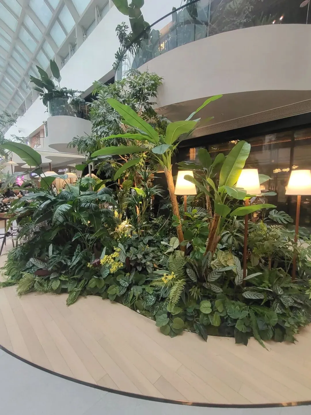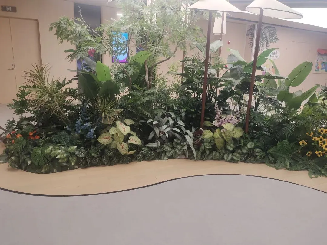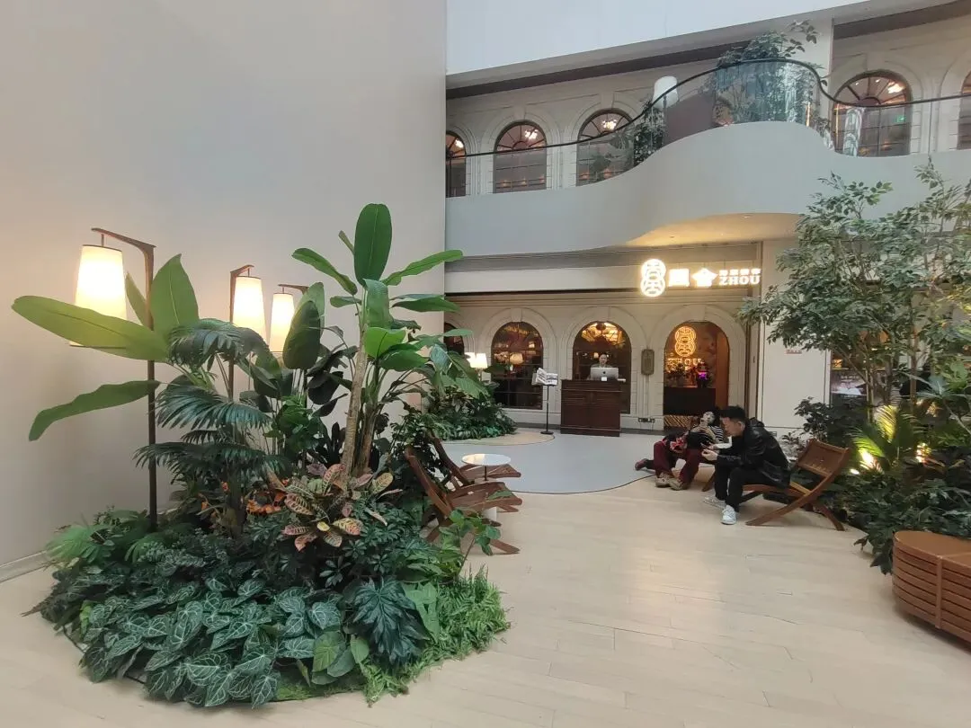 大厅里见到的或是精巧配置的绿植,或者是各种舒适的休闲座椅。还布置了几棵高大的乔木,使得花园的树木层次比较丰富。