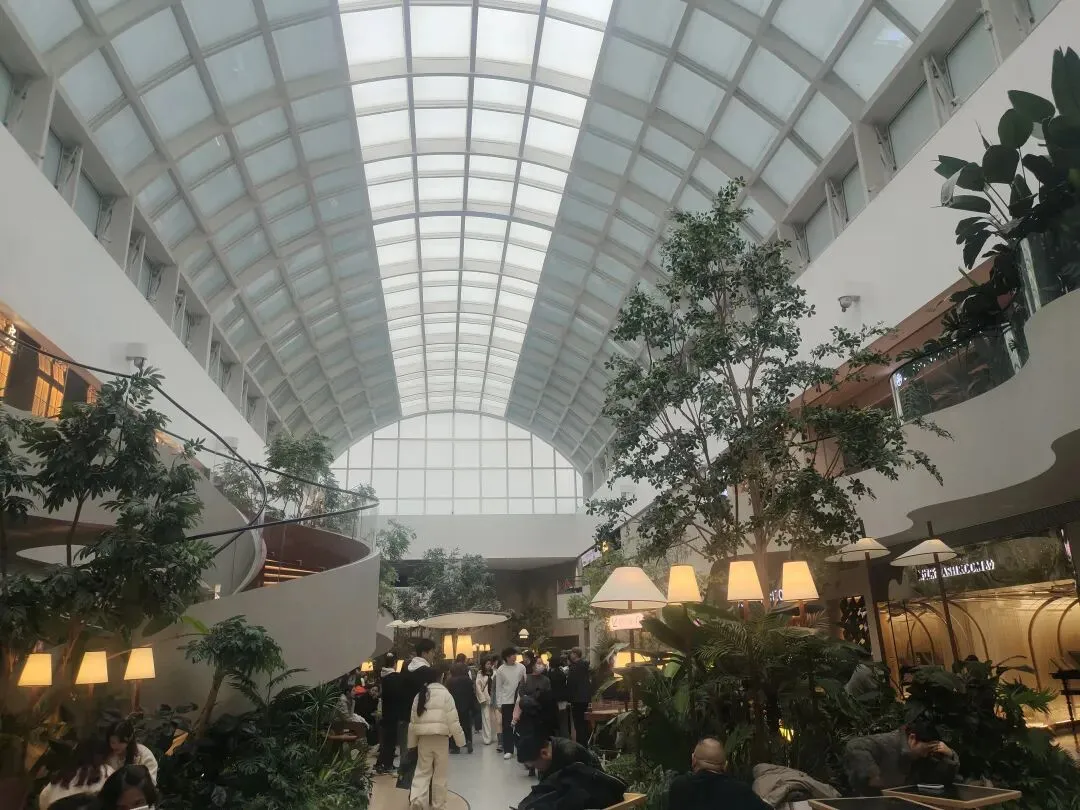 此空间的中部为带玻璃穹顶的花园式休息空间,两边为各式各样的特色餐厅。