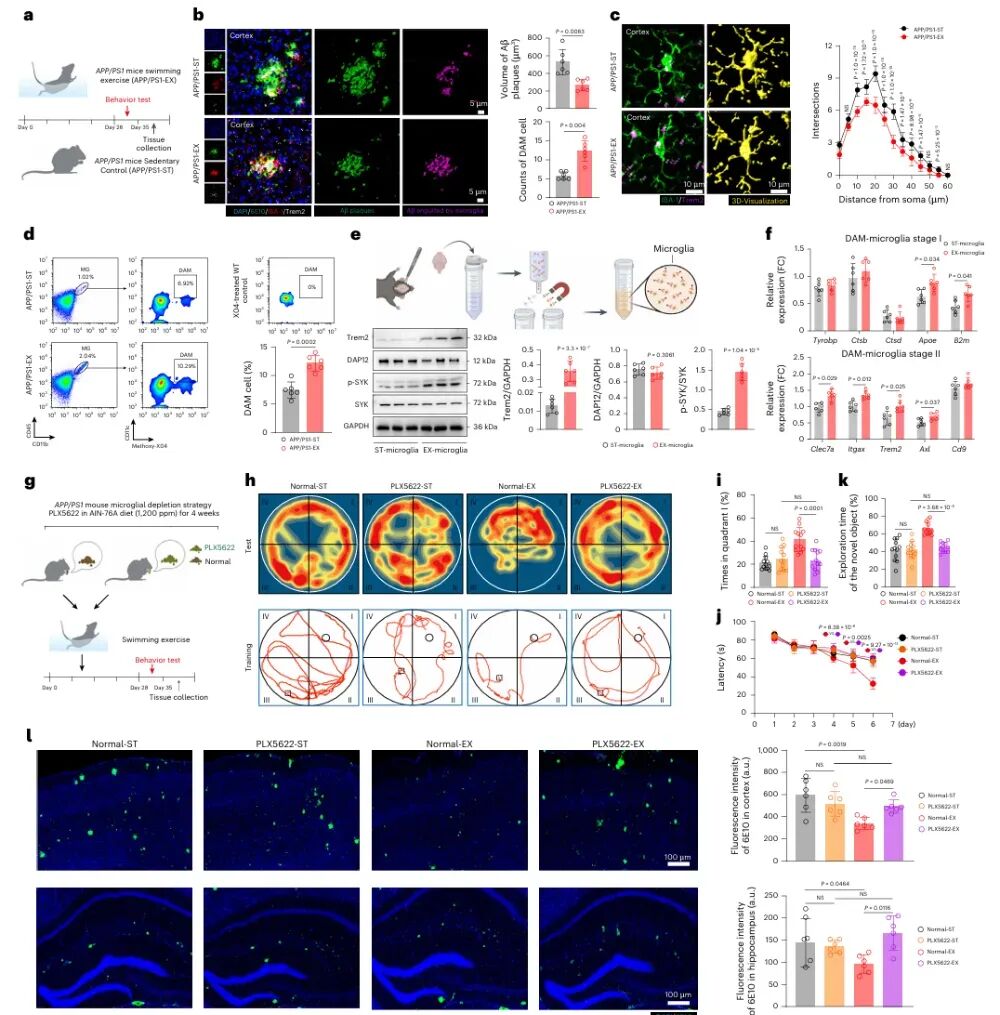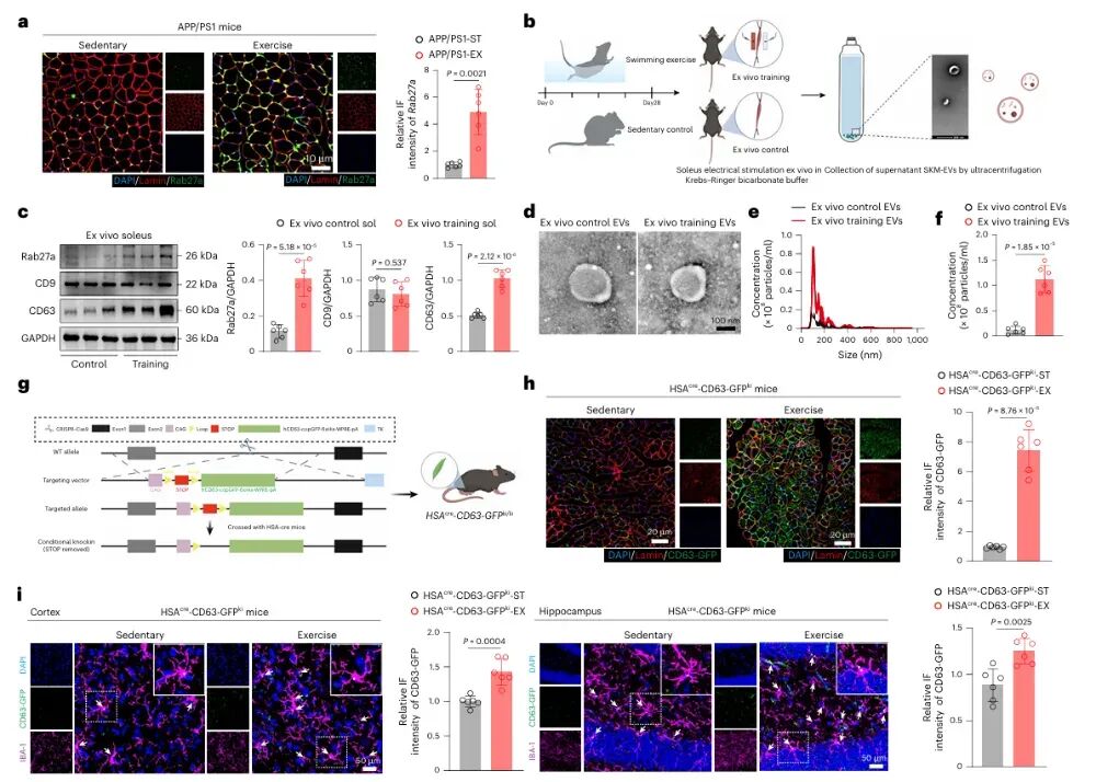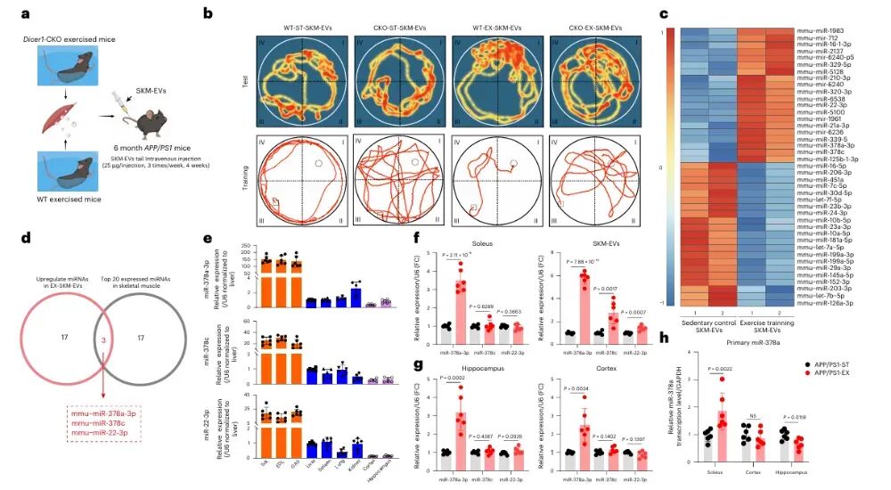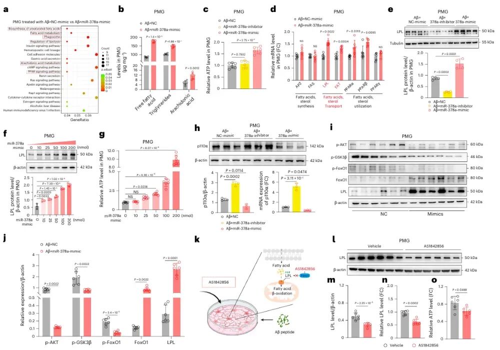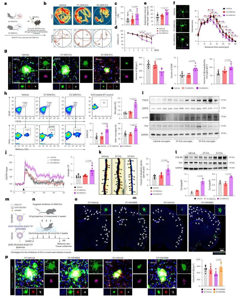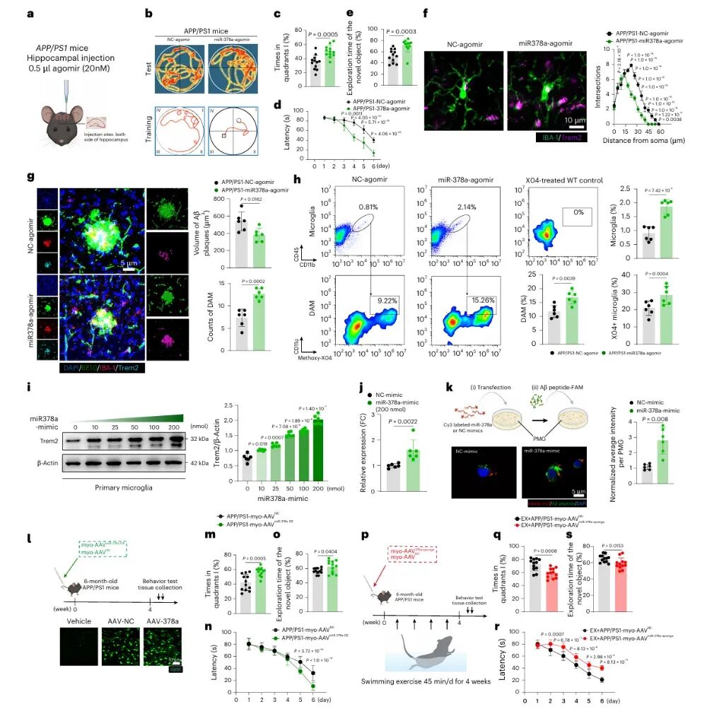 近年来,骨骼肌作为内分泌器官的角色逐渐受到重视——它不仅能分泌肌因子调控远端器官,还可释放细胞外囊泡介导跨器官通讯。与此同时,神经炎症研究揭示了小胶质细胞在AD中的关键作用,尤其是2017年鉴定的疾病相关小胶质细胞亚群DAM,具有强大的Aβ清除能力。然而,运动是否通过调控DAM发挥神经保护作用尚不清楚。南京大学郭保生教授、蒋青教授和chenxiang等人提出核心假设:运动诱导骨骼肌分泌富含miR-378a-3p的EVs,经血液循环进入大脑后被小胶质细胞摄取,通过增强脂质代谢促进DAM极化和Aβ清除,从而改善认知功能。相关内容以“Exercise alleviates cognitive dysfunction in Alzheimer’s disease mice via skeletal muscle-derived extracellular vesicles that enhance plaque clearance by microglia”为题发表在《Nature Aging》上。图1游泳运动改善APP/PS1小鼠认知功能并激活疾病相关小胶质细胞该图首先呈现了实验设计流程,随后通过免疫荧光三维重建显示运动组小鼠大脑皮层和海马区淀粉样斑块体积显著减小、DAM细胞数量增多且对斑块的吞噬能力增强,Sholl分析揭示了运动诱导小胶质细胞呈现典型的极化形态——分支减少、胞体增大。流式细胞术进一步证实运动组CD11c和methoxy-X04双阳性DAM比例显著升高,Western blot和PCR分析显示Trem2、p-SYK等DAM标志物表达上调。关键的功能验证实验通过PLX5622药物清除小胶质细胞,发现这完全消除了运动对认知功能的改善作用,伴随Aβ斑块积累增加和突触可塑性指标下降,从而确立小胶质细胞激活是运动改善AD认知功能的必要环节。图2运动促进骨骼肌来源EVs分泌及其进入小胶质细胞的过程免疫荧光显示运动小鼠比目鱼肌中EVs分泌关键蛋白Rab27a表达显著升高,离体肌肉电刺激训练模型结合Western blot证实运动上调ALiX、CD9、CD63、Rab27a等EVs生物合成和分泌基因的表达。透射电镜和纳米颗粒追踪分析显示离体训练组EVs直径约80nm且分泌量显著增加。研究者构建了骨骼肌特异性CD63-GFP报告基因小鼠,直接观察到运动后GFP标记的SKM-EVs在肌肉中积累增加,更重要的是这些EVs能够穿越血脑屏障进入皮层和海马,并被IBA-1阳性小胶质细胞摄取,体外PKH26标记实验进一步证实SKM-EVs可被原代小胶质细胞和BV2细胞摄取。图3运动诱导的SKM-EVs通过激活小胶质细胞改善认知功能尾静脉注射实验显示,运动组SKM-EVs显著改善APP/PS1小鼠的空间记忆和新奇物体识别能力,诱导小胶质细胞极化形态改变,增强DAM对Aβ斑块的吞噬,降低可溶性Aβ水平,并提升突触可塑性相关蛋白PSD-95和Syn的表达及LTP水平;而久坐组SKM-EVs无此效应。反之,利用RGDLTTP肽修饰的脂质体包裹GW4869特异性阻断骨骼肌EVs分泌后,运动对认知功能的改善作用被完全消除,Aβ斑块清除受阻,DAM极化受抑。图4SKM-EVs中miRNA的功能贡献并鉴定miR-378a-3p为关键效应分子通过构建骨骼肌特异性Dicer1条件敲除小鼠阻断miRNA成熟,发现敲除鼠运动后SKM-EVs丧失认知改善功能,而野生型运动SKM-EVs仍有效,证明miRNA是必需功能组分。深度miRNA测序筛选出20个在运动组EVs中显著上调的miRNA,结合组织表达数据库分析锁定miR-378a-3p、miR-378c和miR-22-3p三个候选分子,其中仅miR-378a-3p在骨骼肌和SKM-EVs中均显著上调,且其成熟形式在海马和皮层升高而初级转录本不变。图5miR-378a-3p对认知功能和DAM激活的调控作用海马直接注射miR-378a-3p-agomir显著改善APP/PS1小鼠认知表现,增强c-Fos表达提示突触可塑性提升,诱导DAM极化形态并促进Aβ清除。体外实验显示miR-378a-3p模拟物增强原代小胶质细胞迁移能力、Trem2表达和Aβ肽吞噬。肌肉靶向AAV介导的miR-378a-3p过表达提升血清和脑内EVs及脑组织miR-378a-3p水平,改善认知并降低Aβ负荷;而miR-378a-3p海绵敲低则抵消运动的认知保护效应。图6miR-378a-3p通过靶向p110α调控脂质代谢促进小胶质细胞激活RNA测序KEGG分析显示miR-378a-3p模拟物处理显著改变原代小胶质细胞脂肪酸代谢通路,具体表现为甘油三酯水平升高、ATP产生增加、脂蛋白脂肪酶LPL表达上调。已知p110α是PI3K催化亚基和miR-378a-3p直接靶点,实验证实miR-378a-3p模拟物降低p110α表达,进而抑制AKT和GSK3β磷酸化、促进FoxO1入核,最终上调LPL表达;FoxO1抑制剂AS1842856可阻断LPL上调和ATP产生,揭示miR-378a-3p-p110α-AKT-GSK3β-FoxO1-LPL轴是调控DAM脂质代谢和吞噬功能的核心通路。图7过表达miR-378a-3p的肌管EVs作为治疗策略研究者构建miR-378a-3p过表达的C2C12肌细胞系,诱导分化为肌管后分离EVs,尾静脉注射APP/PS1小鼠显示myotubemir378aOE-EVs显著改善认知功能、减少Aβ斑块、增强DAM极化和吞噬、提升突触可塑性标志物。微胶质细胞清除实验证实该治疗效应依赖于DAM的存在。这些结果表明工程化改造的过表达miR-378a-3p肌管EVs可模拟运动的神经保护效果。该研究不仅首次建立了"骨骼肌-小胶质细胞"跨器官通讯的理论框架,丰富了运动医学和神经退行性疾病领域的认知,更为无法从传统运动中获益的AD患者提供了潜在的治疗替代方案,具有重要的科学价值和临床转化前景。