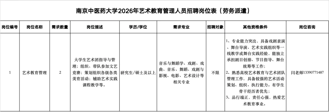 附件:南京中医药大学2026年艺术教育管理人员招聘岗位表(劳务派遣).xlsx