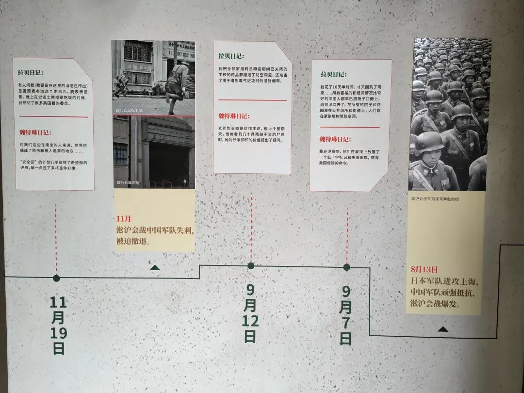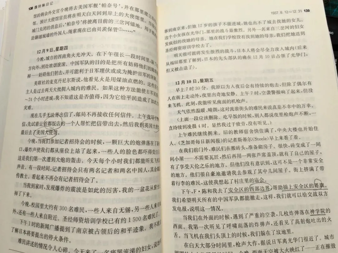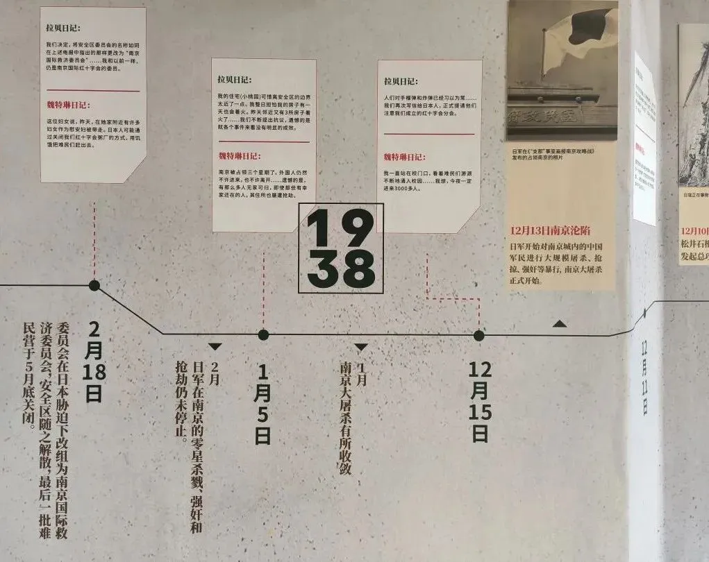 日记中还提到了安全区的西部边界,插上安全区的界旗,这个时间是1937年的12月10日,在8号这一天,“接受了第一批难民,安全区的旗帜竖了起来——红十字外加一个红色圆圈”。