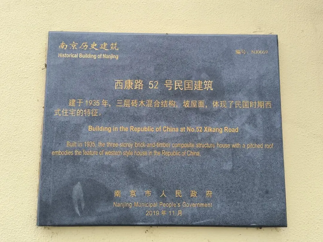 建于1935年,大门虚掩着,这一带那么多民国建筑大多围墙圈着,大门紧闭,难得可以探身拍到全景。看起来建筑完好,能在1937年的南京劫难中幸存,再次证实其在“安全区”之内。