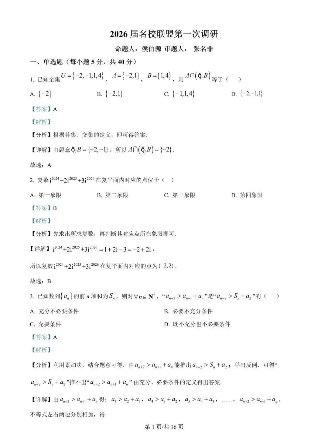 2026届江苏南京六合区名校联盟高三下学期一模数学+物理试题+答案(2026.3)