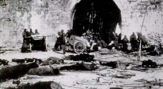 图中城门口横七竖八,全是倒下的人,门洞里还蹲着拿枪的兵,拉来的小炮靠在墙边,地上有推车的印子,像是刚把一车人倒下去,太阳晒着,影子往后退,一天这么过去,气味都变了。