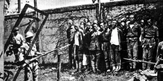 这个围到墙角的队,就是抓来的百姓,手被反绑着,刺刀在前头晃,绳子穿成一串拽着走,谁要是脚步慢半拍,后背就被戳一下,舅舅说看见这种照片,喉咙会干,想喝水又不敢咽。