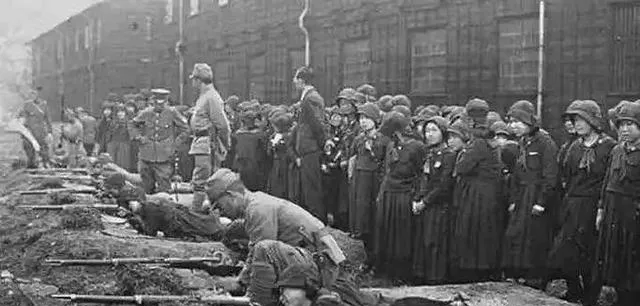 图上这一排趴在坑沿的枪口正吐火,另一边是一群被逼着站队的女人,头巾灰黑,脸也灰黑,神情木着,像被冻住的水,旁边的兵把腰一弯,一发一发往外送,地上泥被翻起来,像鱼鳞。