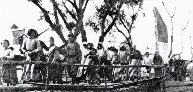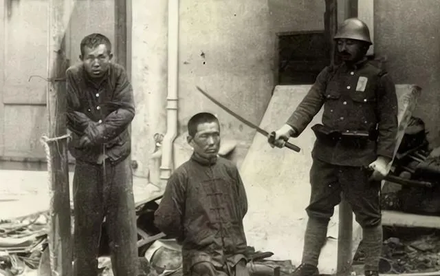 这个场面不用多解释,亮在空中的长刀,跪着的青年背脊紧得像弓,旁边几个人站着看,脸上冷硬得像冬天的土块,刀落下去的那一下没有声音,照片把声音都咽住了。