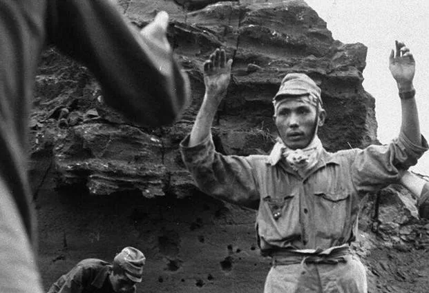 这个举着手的人,嘴唇开裂,脖子上绑着脏布条,后面有人半跪在土坡下,枪口伸过来,影子压在脸上,像是天快塌下来的样子。