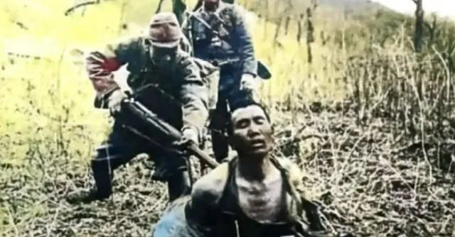 这张在野地里,枯枝乱草,刺刀抵在一个人的背脊上,他仰着头,眼神涣散,草干得脆,脚下一踩就响,风把灰尘吹进镜头里,像砂纸糊在眼皮上。