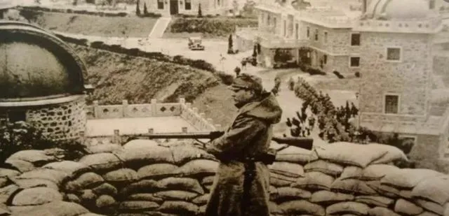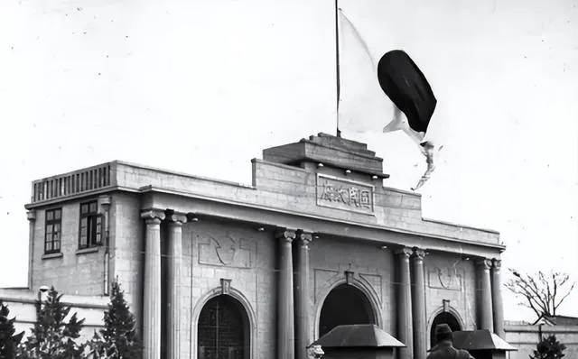 最后这张,是他们把旗插在屋顶的时刻,正门上方四个字一清二楚,风把旗面掀起来,黑白两色在空里抖,门前的人抬头看着,有人把帽檐压得更低了,我妈说,那天南京天冷得咬人,可大家心更冷。
