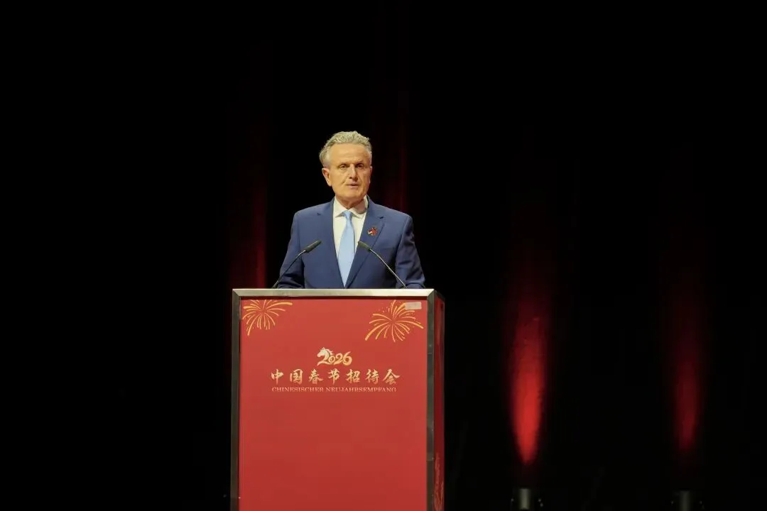 斯图加特市长诺佩尔在致辞中以斯图加特城市徽章上的骏马切入,回顾城市与马的历史渊源,送上马年新春祝福。他表示,“马”象征着力量、活力与开拓精神,也体现了斯图加特与南京携手并进、共创未来的坚定信心。他深情回忆去年率团访问南京的经历,强调两市在经贸、科技、教育等领域高度契合,在企业合作和展会交流等领域成果丰硕。诺佩尔市长还将斯图加特与南京的城市友谊称为“施瓦本的第八大发明”,并表示斯图加特十分珍视同南京的伙伴关系,愿在现有基础上不断拓展合作空间。