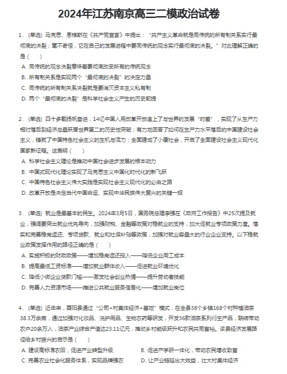 2017-2024学年南京各区高三二模政治真题及答案解析