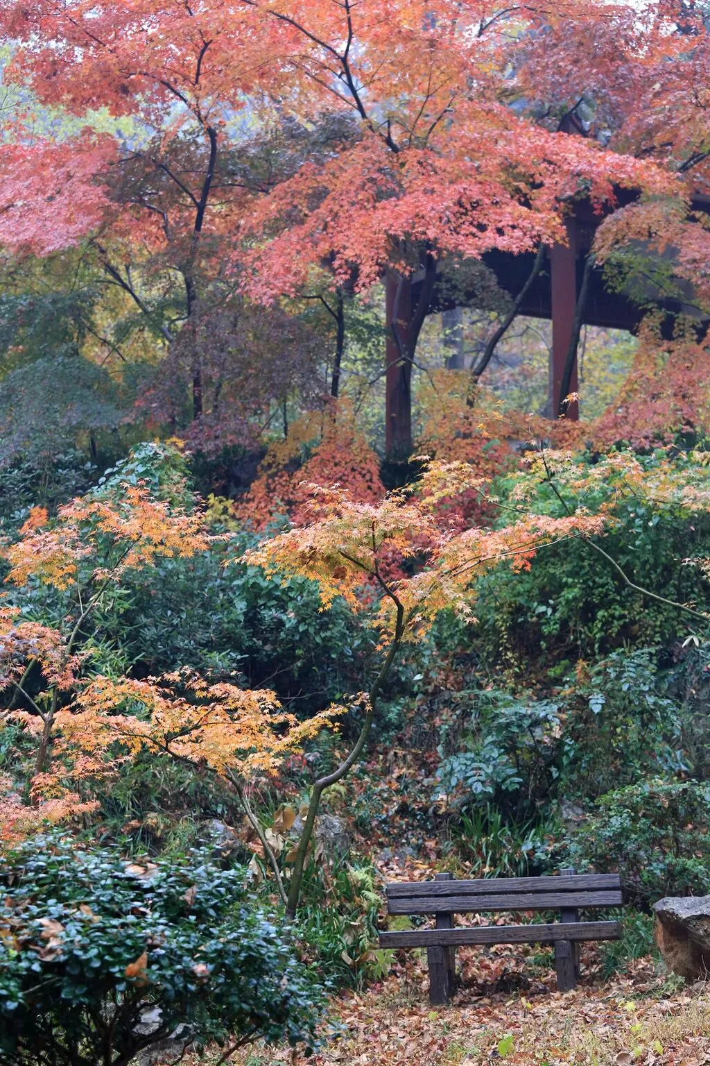 这次来栖霞山,正赶上阴雨天。虽说对拍照不太有利,但雨中的栖霞山,红叶却别有一番风致。被雨水浸润的叶片,色泽更显沉郁深邃,如同被岁月反复渲染的古锦。空气里弥漫着潮湿的泥土与草木清气,古寺飞檐下连绵的雨帘,都为这场秋日盛景蒙上了一层静谧又温柔的滤镜。