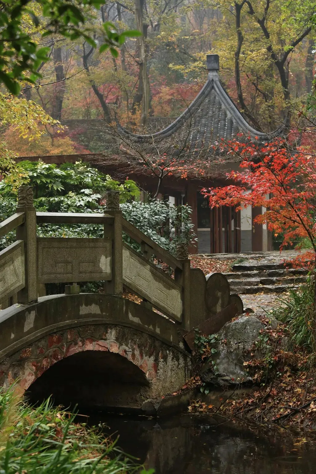 淅淅沥沥的小雨几乎没停,叶片上晶莹的水珠、石阶上湿透的落叶、檐角缓缓滴落的水线…… 这些都是晴日里难觅的、带着生命呼吸感的细节。