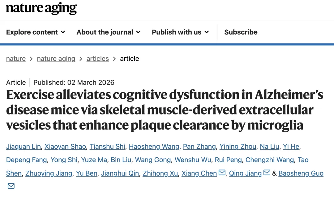 我们常说——生命在于运动,之前已有研究显示,运动能够改善阿尔茨海默病(AD)小鼠模型的学习和记忆能力。在人类中,运动与降低痴呆症风险、减缓认知能力随年龄下降的速度以及延缓痴呆症发病(包括遗传性阿尔茨海默病)有关。然而,运动对阿尔茨海默病(AD)患者认知益处的潜在机制,目前尚不完全清楚。2026 年 3 月 2 日,南京大学医学院附属鼓楼医院郭保生、蒋青、陈翔等人在 Nature 子刊 Nature Aging 上发表了题为:Exercise alleviates cognitive dysfunction in Alzheimer’s disease mice via skeletal muscle-derived extracellular vesicles that enhance plaque clearance by microglia 的研究论文。