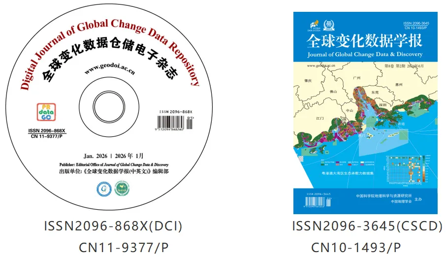《全球变化数据仓储电子杂志(中英文)》《全球变化数据学报(中英文)》,由中国科学院地理科学与资源研究所、中国地理学会联合主办,中国科学院主管的中英文双语、元数据-实体数据-数据论文关联配套出版、被纳入“卓越计划(分别为高起点刊和期刊群刊)”和“世界数据系统(WDS)”的学术期刊,并于2018年、2021年两度获得联合国世界信息峰会奖(电子科学组冠军奖),2025年再获联合国世界信息峰会电子科学类提名奖。