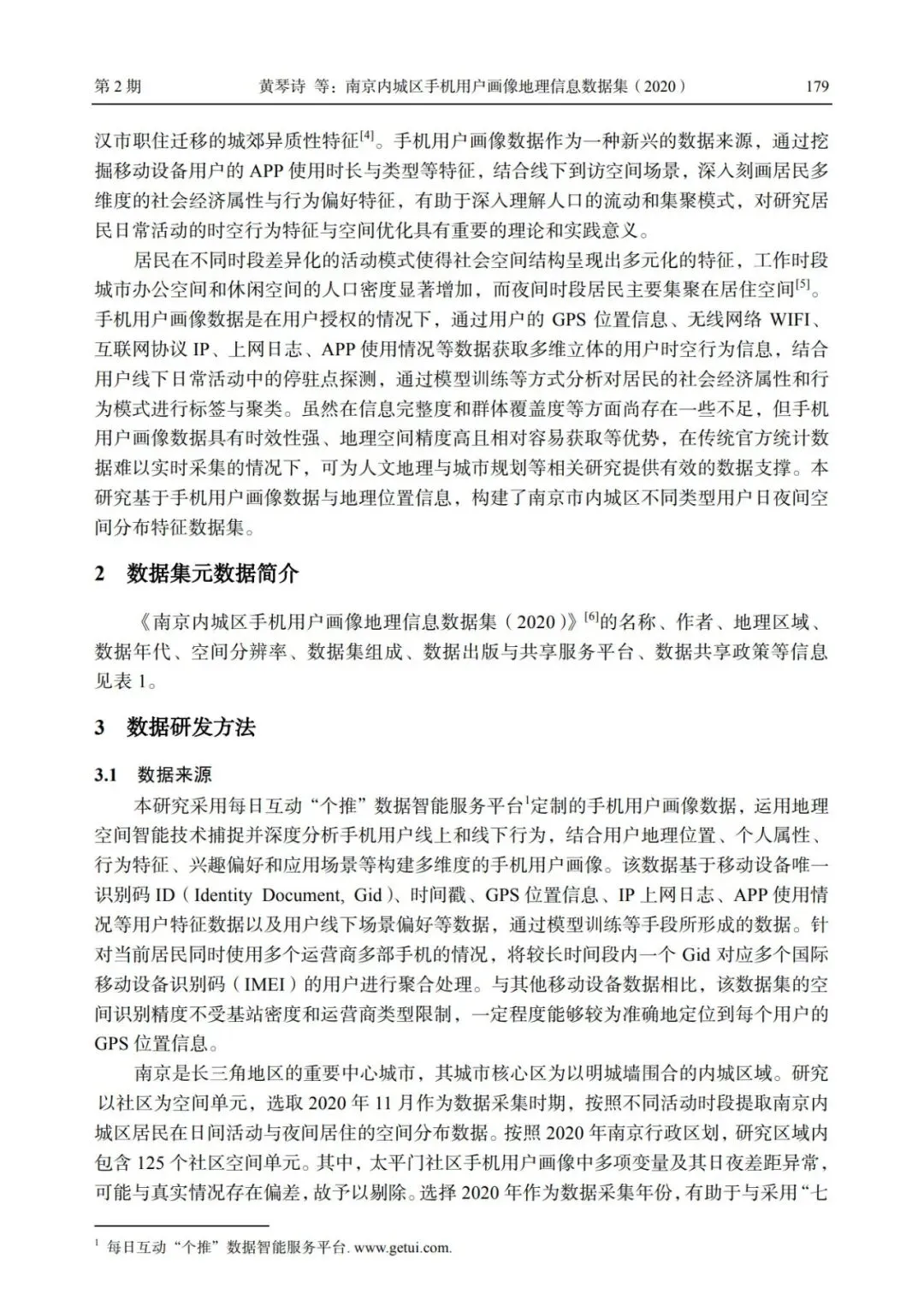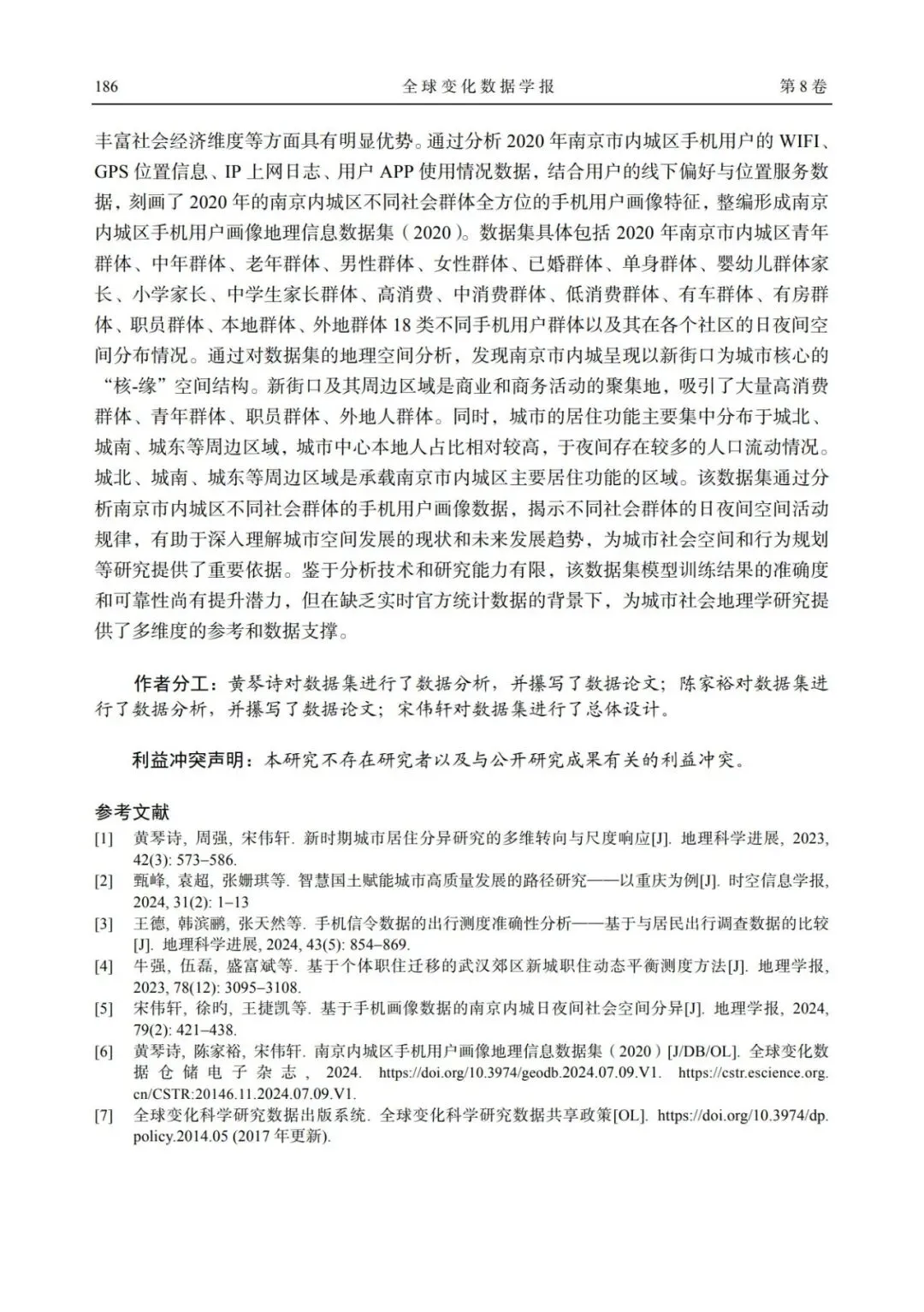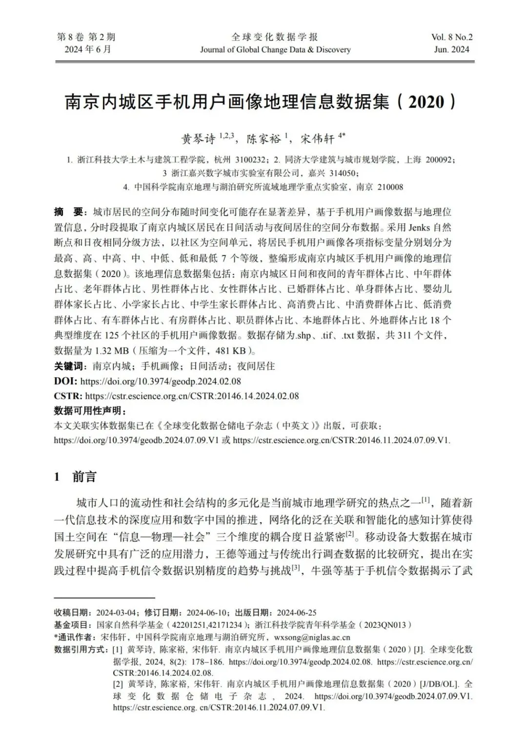 基金项目:国家自然科学基金(42201251,42171234);浙江科技学院青年科学基金(2023QN013)数据引用方式:黄琴诗, 陈家裕, 宋伟轩*. 南京内城区手机用户画像地理信息数据集(2020)[J/DB/OL]. 全球变化数据仓储电子杂志(中英文), 2024. https://doi.org/10.3974/geodb.2024.07.09.V1.关联论文:宋伟轩, 徐旳, 王捷凯等. 基于手机画像数据的南京内城日夜间社会空间分异[J].地理学报, 2024, 79(2): 421-438.[1] 黄琴诗, 周强, 宋伟轩. 新时期城市居住分异研究的多维转向与尺度响应[J]. 地理科学进展, 2023, 42(3): 573-586.[2] 甄峰, 袁超, 张姗琪等. 智慧国土赋能城市高质量发展的路径研究: 以重庆为例[J]. 时空信息学报, 2024, 31(2): 1-13.[3] 王德, 韩滨鹂, 张天然等. 手机信令数据的出行测度准确性分析: 基于与居民出行调查数据的比较 [J]. 地理科学进展, 2024, 43 (5): 854-869.[4] 牛强, 伍磊, 盛富斌等. 基于个体职住迁移的武汉郊区新城职住动态平衡测度方法[J]. 地理学报, 2023, 78 (12): 3095-3108.[5] 宋伟轩, 徐旳, 王捷凯等. 基于手机画像数据的南京内城日夜间社会空间分异[J]. 地理学报, 2024, 79(2): 421-438.DOI:10.3974/geodb.2024.07.09.V1