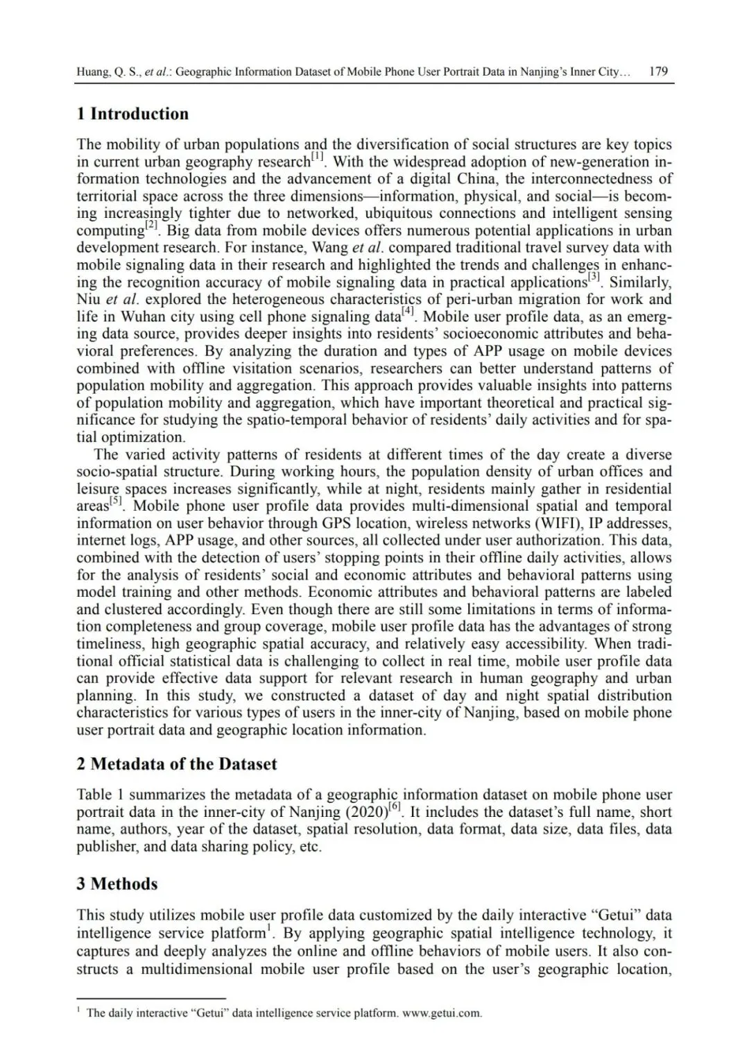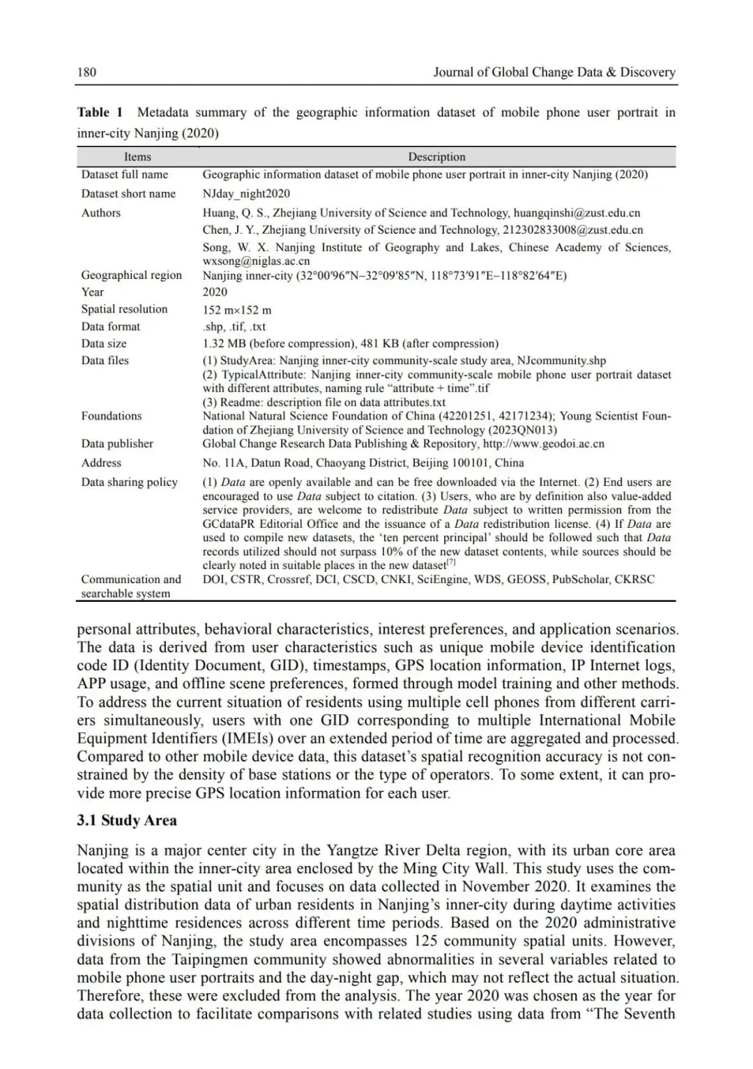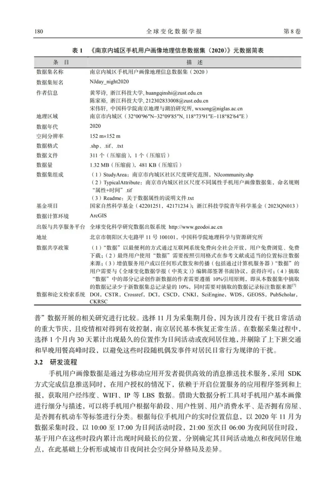 Key Words:Nanjing inner city,mobile phone portraits,daytime activities,nighttime residenceFoundation Item:National Natural Science Foundation of China (42201251, 42171234); Zhejiang University of Science and Technology (2023QN013)Data Citation:HUANG Qinshi, CHEN Jiayu, SONG Weixuan*. Geographic Information Dataset of Mobile Phone User Portrait in Inner-city Nanjing (2020)[J/DB/OL]. Digital Journal of Global Change Data Repository, 2024. https://doi.org/10.3974/geodb.2024.07.09.V1.