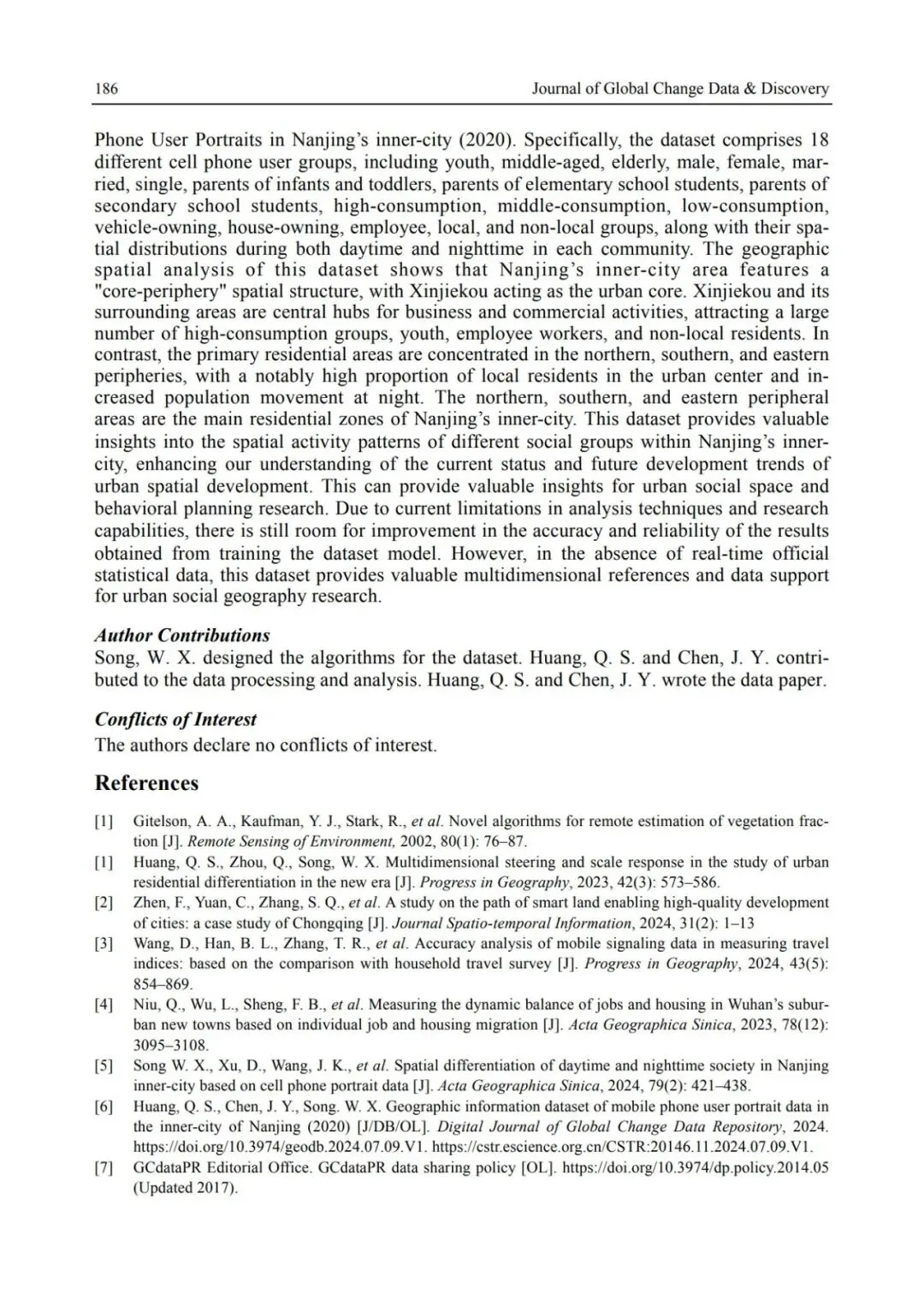 [1] Huang, Q. S., Zhou, Q., Song, W. X. Multidimensional steering and scale response in the study of urban residential differentiation in the new era [J]. Progress in Geography, 2023, 42(3): 573-586.[2] Zhen, F., Yuan, C., Zhang, S. Q., et al. A study on the path of smart land enabling high-quality development of cities: a case study of Chongqing [J]. Journal Spatio-temporal Information, 2024, 31(2): 1-13.[3] Wang, D., Han, B. L., Zhang, T. R., et al. Accuracy analysis of mobile signaling data in measuring travel indices: Based on the comparison with household travel survey [J]. Progress in Geography, 2024, 43(5): 854-869.[4] Niu, Q., Wu, L., Sheng, F. B., et al. Measuring the dynamic balance of jobs and housing in Wuhan's suburban new towns based on individual job and housing migration [J]. Acta Geographica Sinica, 2023, 78 (12): 3095-3108.[5] Song, W. X., Xu, D., Wang, J. K., et al. Spatial differentiation of daytime and nighttime society in Nanjing inner city based on cell phone portrait data [J]. Acta Geographica Sinica, 2024, 79(2): 421-438.DOI:10.3974/geodb.2024.07.09.V1