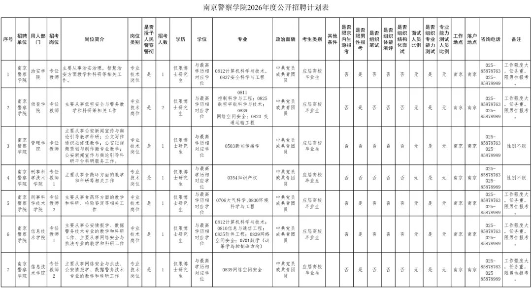 南京警察学院位于江苏省南京市,是中华人民共和国公安部直属的全日制公安类普通本科高等学校。根据事业单位公开招聘有关规定,按照公安机关录用人民警察有关要求,结合我单位实际工作需要,面向社会公开招聘。现将南京警察学院2026年度公开招聘工作有关事项公告如下:
