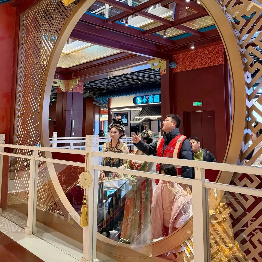 走进五层挑高的“金陵宫”中庭,仰望金箔蟠龙昂首欲飞;穿过龙门桥,看锦鲤戏水;登上屋顶花园,远眺报恩寺琉璃塔。