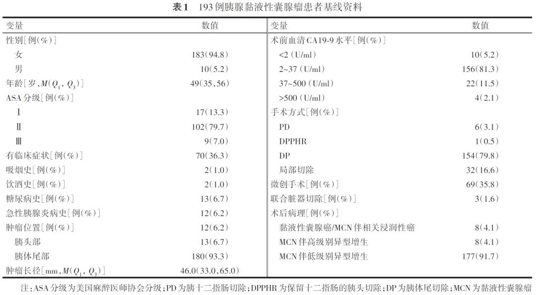 回顾性收集2016年1月至2024年12月间南京医科大学第一附属医院连续收治的193例经手术切除且术后病理确诊为MCN患者的临床病理资料。MCN的诊断依据《2019年世界卫生组织消化系统肿瘤分类》所制定的MCN病理学诊断标准。排除标准:(1)术后病理诊断不明确;(2)病理诊断为导管内乳头状黏液瘤、浆液性囊腺瘤或实性假乳头状瘤等其他胰腺囊性病变;(3)关键临床数据缺失。本研究通过医院伦理委员会审批(审批号:2025⁃SR⁃988)。