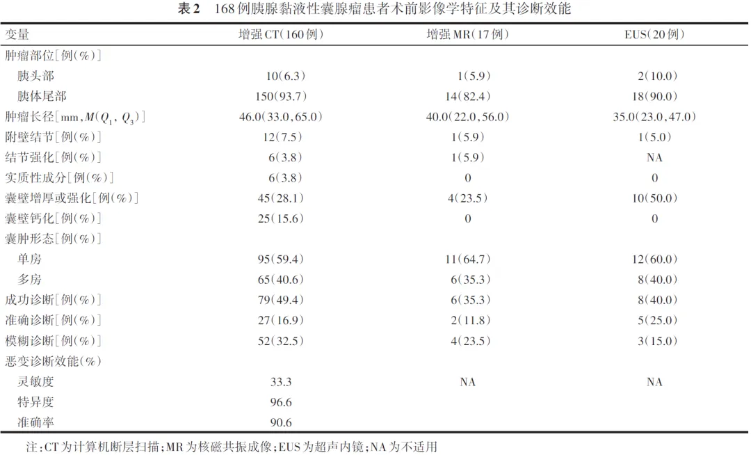 2.影像学特征:根据增强CT、增强MR、超声内镜(endoscopic ultrasound, EUS)的影像表现,记录肿瘤位置(胰头部或胰体尾部)、肿瘤长径、附壁结节、结节强化表现、实质性成分、囊壁增厚或强化、囊壁钙化、囊肿单房或多房。依据影像学诊断结果,将MCN的确诊情况分为准确诊断和模糊诊断。其中准确诊断定义为影像诊断报告中明确提及“黏液性囊腺瘤”,且为唯一诊断;模糊诊断定义为影像诊断报告中仅提及“囊腺瘤”或“黏液性囊肿”,且为唯一诊断。某影像学检查方法的成功诊断率定义为采用该方法检查的病例中,准确诊断与模糊诊断的病例数之和占总检查病例数的比例。以术后病理结果为金标准,评价各项影像学检查对恶性病变的诊断效能。根据《胰腺囊性疾病诊治指南(2015)》与《欧洲胰腺囊性肿瘤循证指南(2018年)》中提出的手术指征,评估患者是否符合相关手术建议。