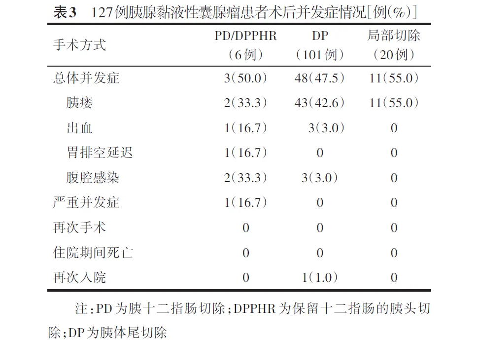 本研究队列中的127例患者总体并发症发生率为48.8%(62/127),严重并发症发生率为0.8%(1/127),无再次手术患者,住院期间无死亡。具体并发症包括胰瘘(B+C级)56例(44.1%),出血4例(3.1%),胃排空延迟1例(0.8%),腹腔感染5例(3.9%)。不同手术方式的并发症发生情况详见表3。