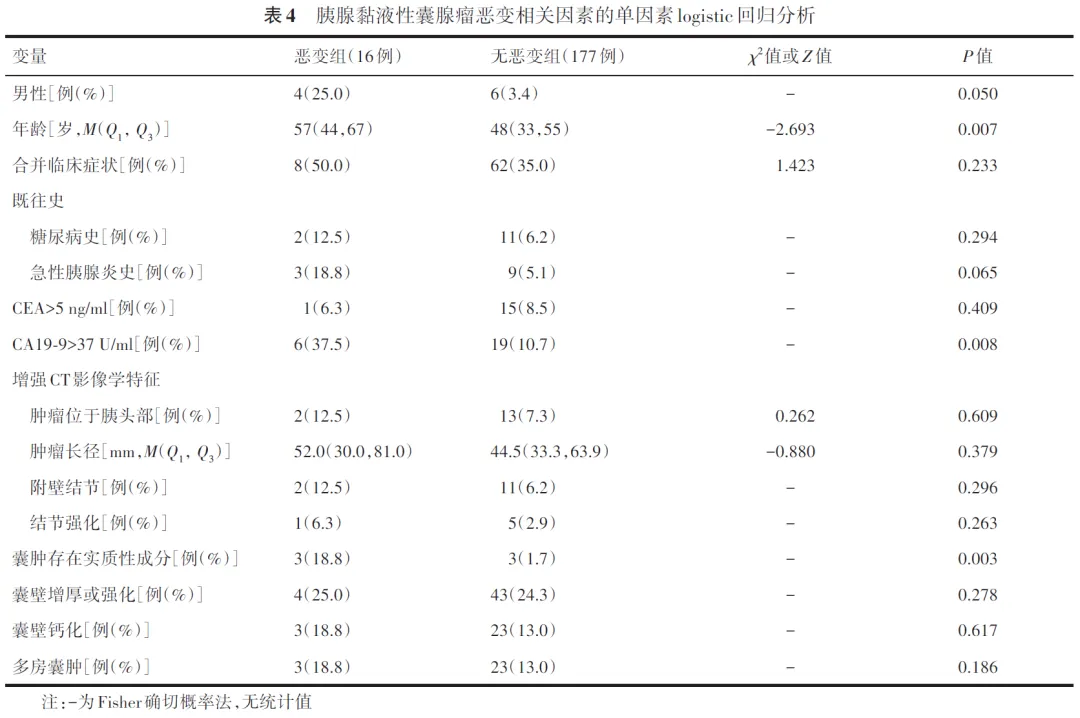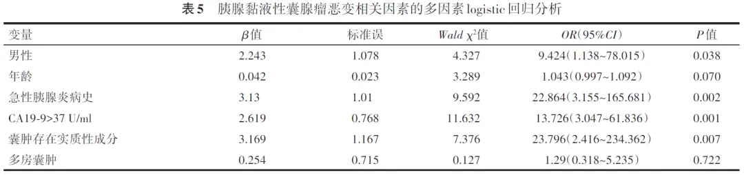 单因素logistic回归分析结果显示,MCN发生恶变与男性、高龄、术前血清CA19⁃9>37 U/ml以及增强CT提示囊肿存在实质性成分相关(表4)。